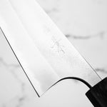 Japanese White Steel #2, a traditional high-carbon steel, is cherished for its purity and fine grain structure, enabling razor-sharp edges, at the cost of being reactive. It is one of the easiest steels to sharpen, but cannot be left wet for even short periods otherwise rust spots can occur. If you’re fastidious in your knife maintenance, this knife steel can be extremely rewarding to use.