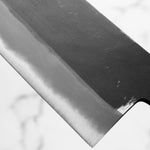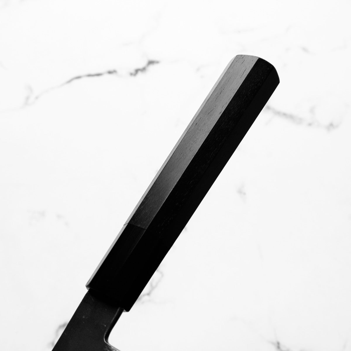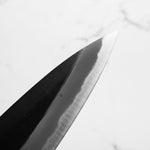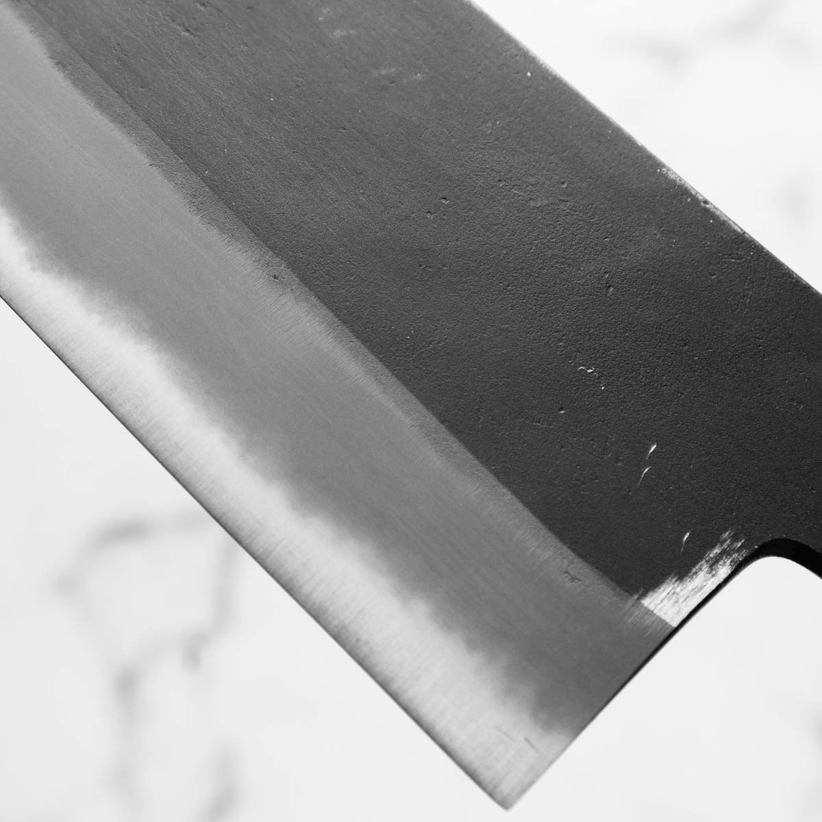 Japanese White Steel #2, a traditional high-carbon steel, is cherished for its purity and fine grain structure, enabling razor-sharp edges, at the cost of being reactive. It is one of the easiest steels to sharpen, but cannot be left wet for even short periods otherwise rust spots can occur. If you’re fastidious in your knife maintenance, this knife steel can be extremely rewarding to use.