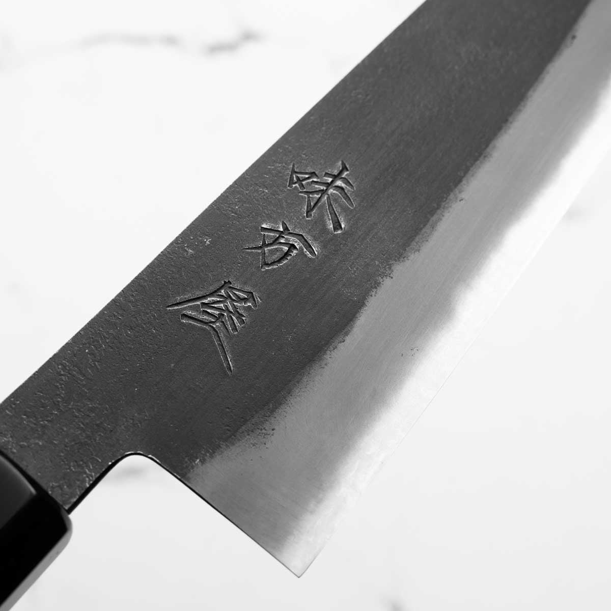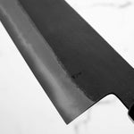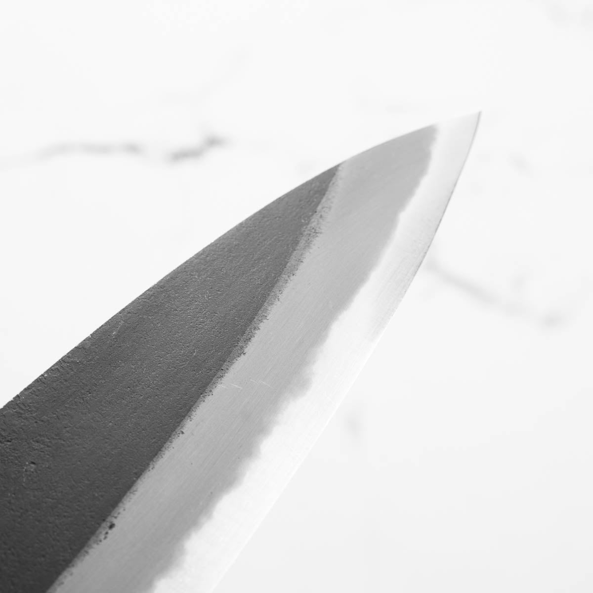 Japanese White Steel #2, a traditional high-carbon steel, is cherished for its purity and fine grain structure, enabling razor-sharp edges, at the cost of being reactive. It is one of the easiest steels to sharpen, but cannot be left wet for even short periods otherwise rust spots can occur. If you’re fastidious in your knife maintenance, this knife steel can be extremely rewarding to use.