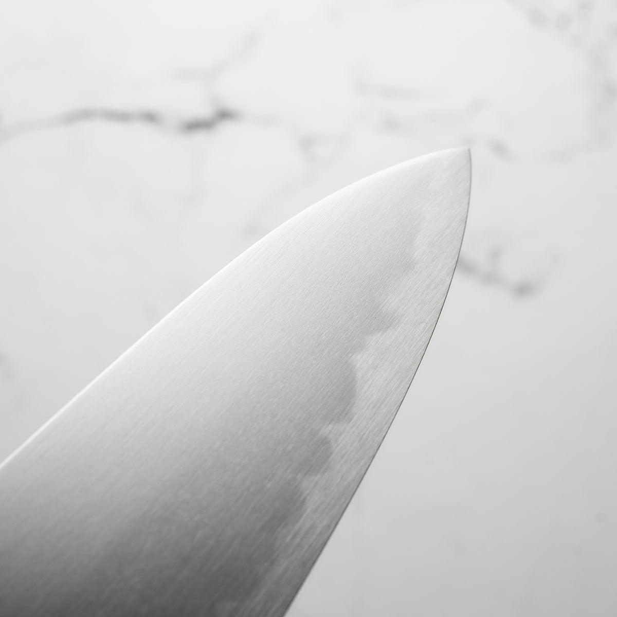 This knife is made from a high-carbon steel and as such, will require a little more care than a regular off-the-shelf knife. It must be dried shortly after use, as prolonged exposure to moisture can cause rust spots to appear. A very light coat of oil during storage also helps to prevent rust spots. A patina (colouration and seasoning of the steel) will occur with use.