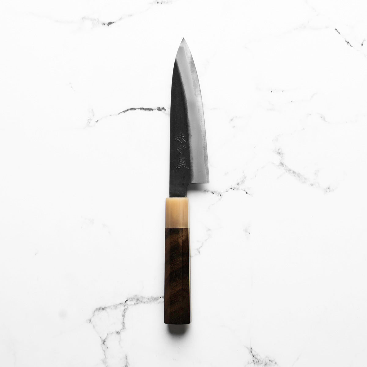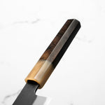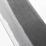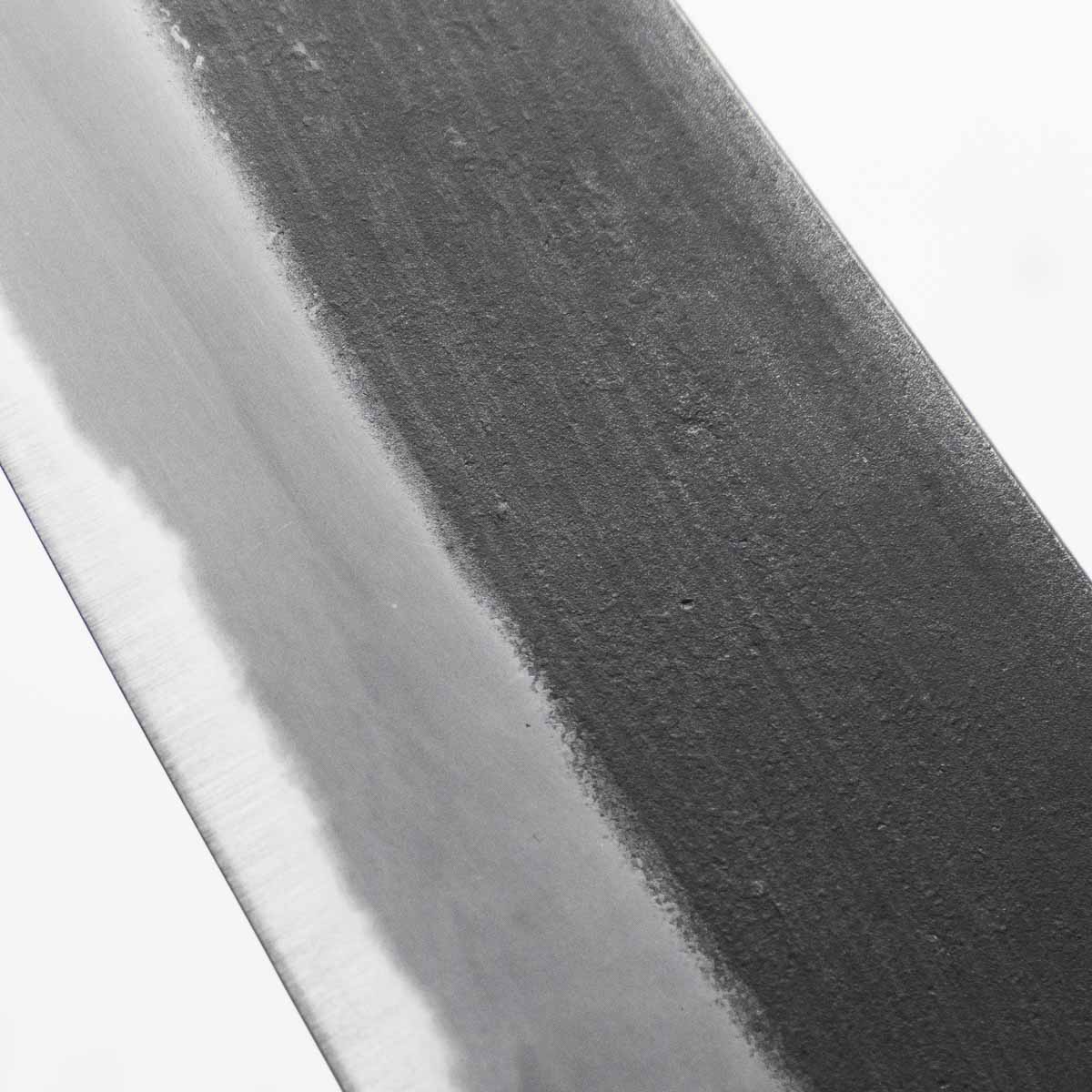 Japanese White Steel #2, a traditional high-carbon steel, is cherished for its purity and fine grain structure, enabling razor-sharp edges, at the cost of being reactive. It is one of the easiest steels to sharpen, but cannot be left wet for even short periods otherwise rust spots can occur. If you’re fastidious in your knife maintenance, this knife steel can be extremely rewarding to use.