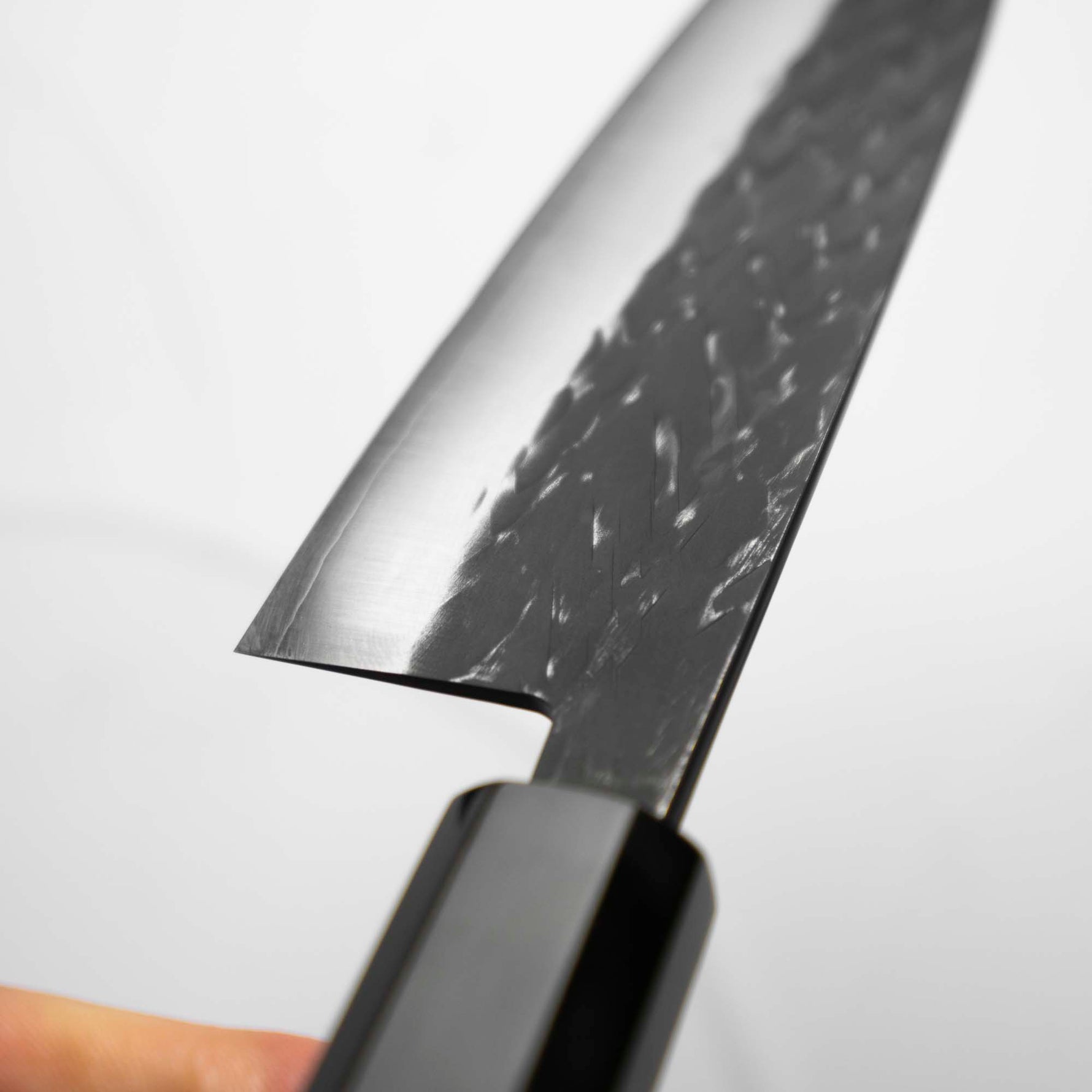 This knife is my first experience with a Japanese knife and I am not disappointed. The knife is as sharp as you can imagine and the tomato test was passed with ease. The only thing that I have seen with this knife is the handle. The wood has dulled, but after talking to support, they suggested bees wax, which has resolved this. The only other thing on the handle is the black material that solidifies the join between blade and handle. This has scratched slightly and easily but doesn't impact the knife, hence only knocking 1 star off. I will be buying more Tadafusa knives as I rate them highly.