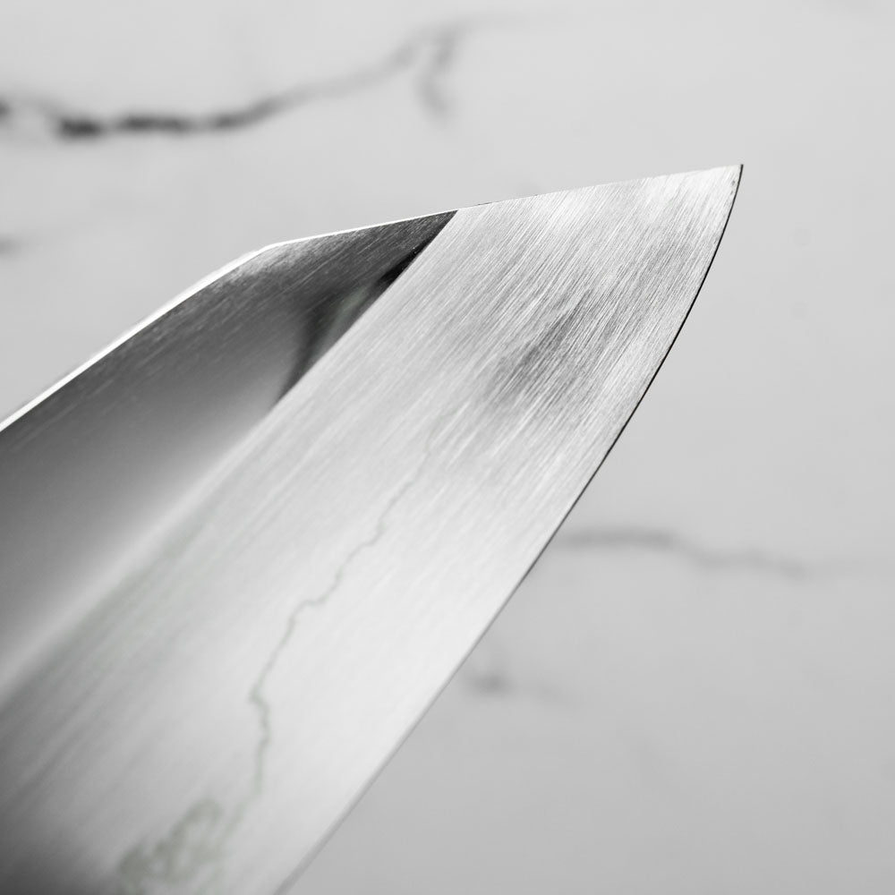 Japanese Ginsan steel, also known as Silver-3 or G3, is an underrated high-grade semi-stainless steel loved by many for being in the ‘goldilocks zone’ of knife steels. It holds a very respectable edge, but is effortless to sharpen. It is considered the semi-stainless version of White 2. It is the knife steel of choice for many home cooks and professional chefs alike.