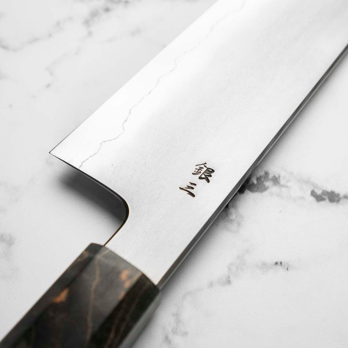 Japanese Ginsan steel, also known as Silver-3 or G3, is an underrated high-grade semi-stainless steel loved by many for being in the ‘goldilocks zone’ of knife steels. It holds a very respectable edge, but is effortless to sharpen. It is considered the semi-stainless version of White 2. It is the knife steel of choice for many home cooks and professional chefs alike.