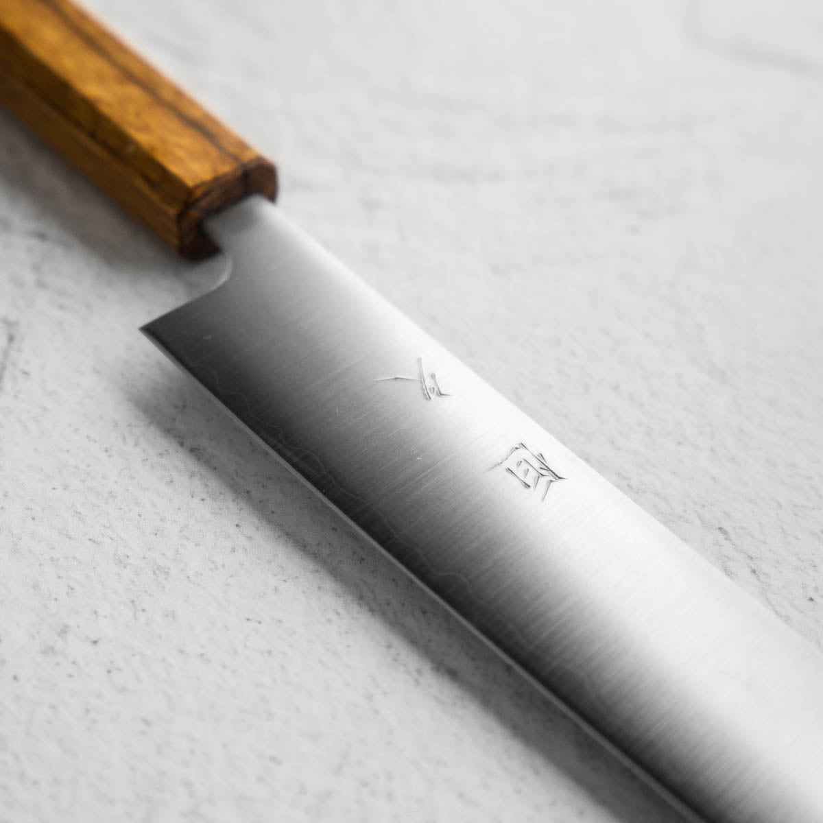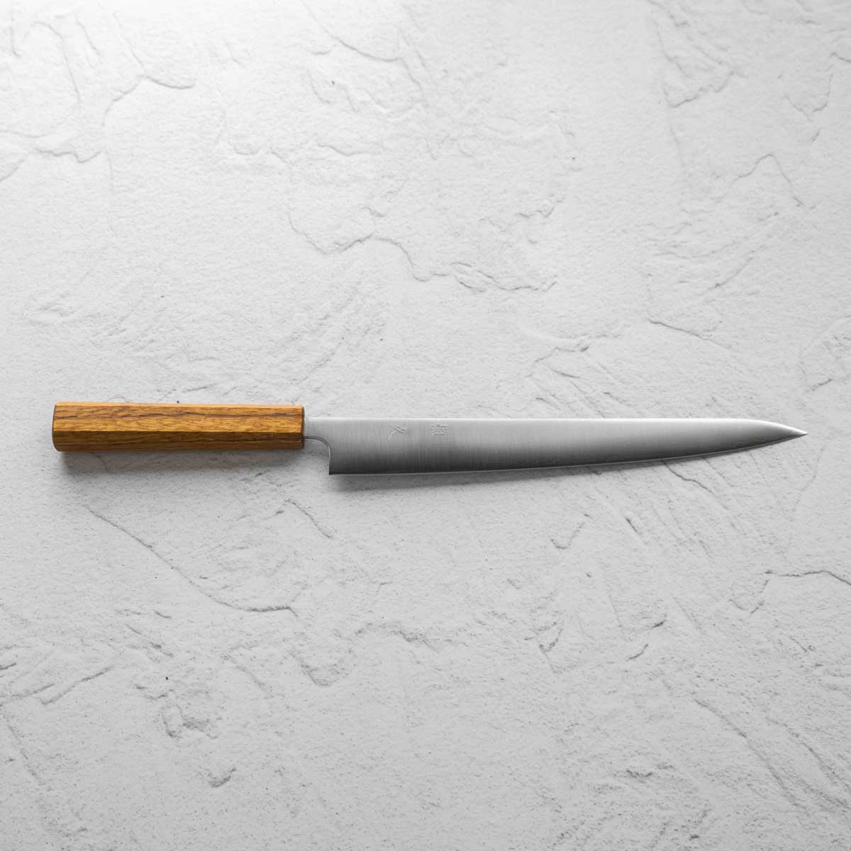 The Sujihiki knife, a traditional Japanese slicer, is designed for carving and fileting. With its long, narrow blade, typically ranging from 240mm to 330mm, it excels in creating clean, smooth cuts through meat and fish. Its length ensures long, uninterrupted strokes, making it perfect for precise slicing tasks.