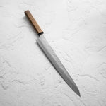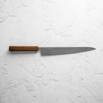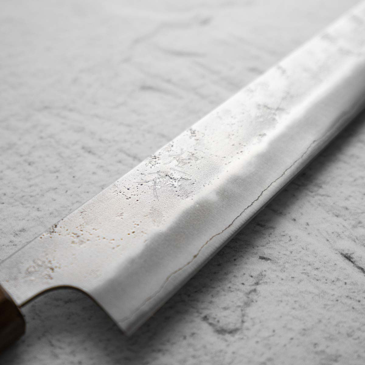The Sujihiki knife, a traditional Japanese slicer, is designed for carving and fileting. With its long, narrow blade, typically ranging from 240mm to 330mm, it excels in creating clean, smooth cuts through meat and fish. Its length ensures long, uninterrupted strokes, making it perfect for precise slicing tasks.