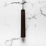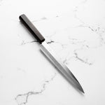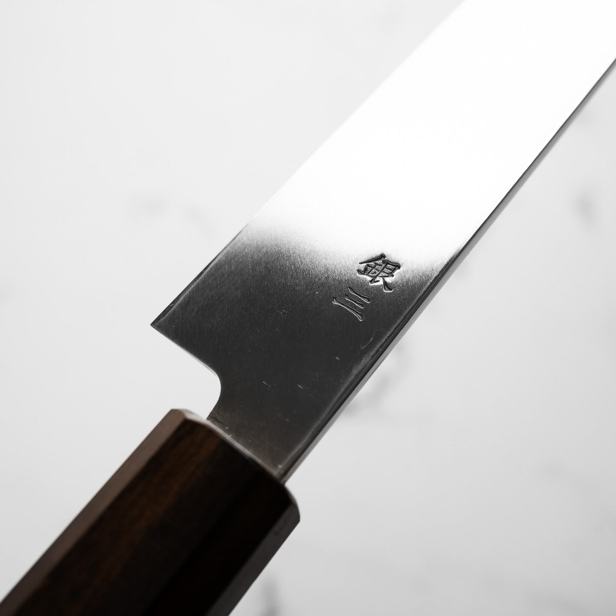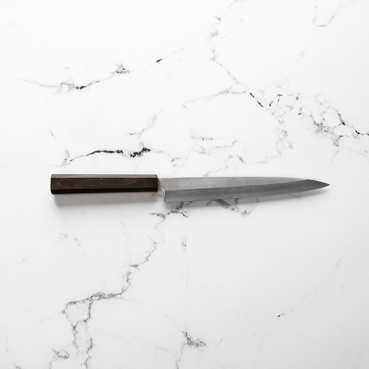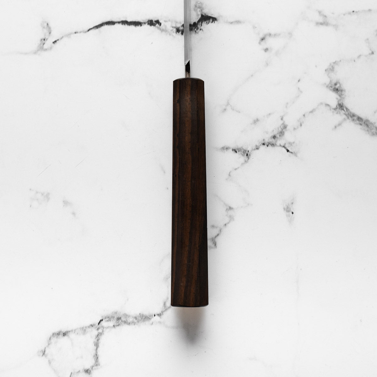 The Yanagiba knife, a staple in traditional Japanese cuisine, is a slender, long-bladed knife primarily used for slicing sashimi and sushi. Its graceful, single-beveled edge guarantees precise, thin cuts, preserving the texture and integrity of the fish. Revered for its sharpness and balance, the Yanagiba is essential for authentic Japanese food preparation.