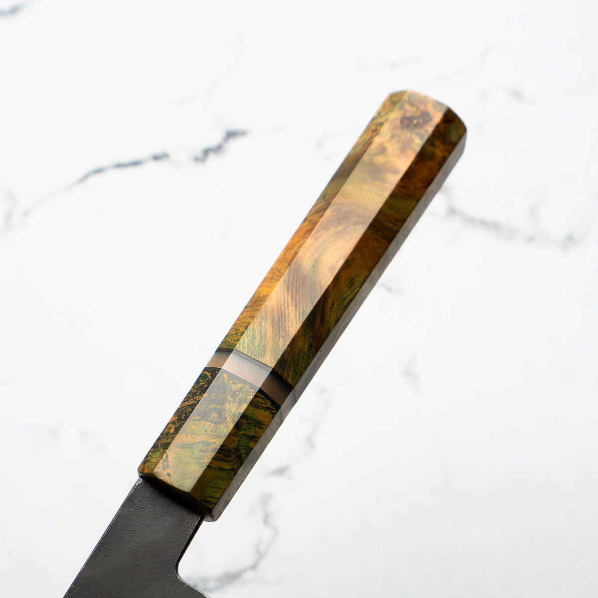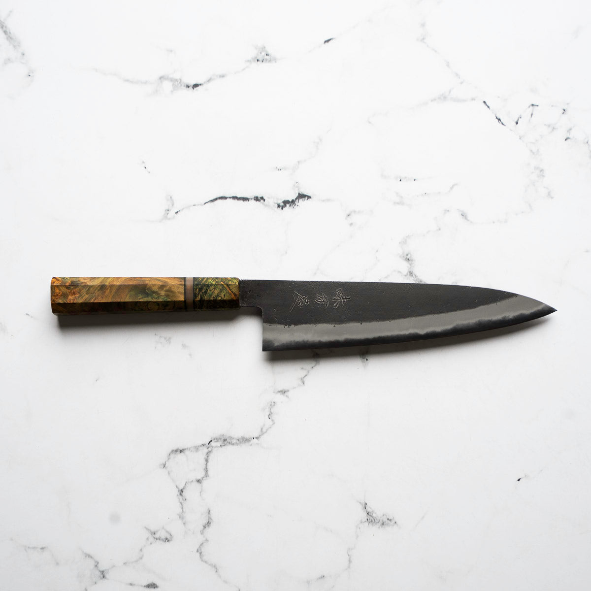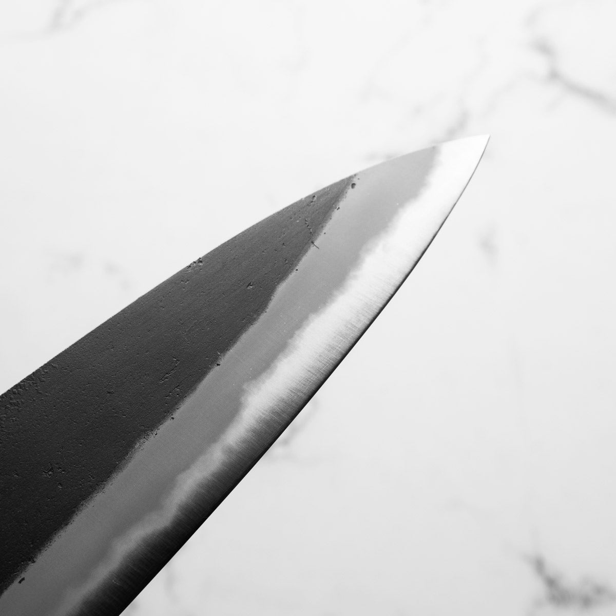 Japanese White Steel #2, a traditional high-carbon steel, is cherished for its purity and fine grain structure, enabling razor-sharp edges, at the cost of being reactive. It is one of the easiest steels to sharpen, but cannot be left wet for even short periods otherwise rust spots can occur. If you’re fastidious in your knife maintenance, this knife steel can be extremely rewarding to use.