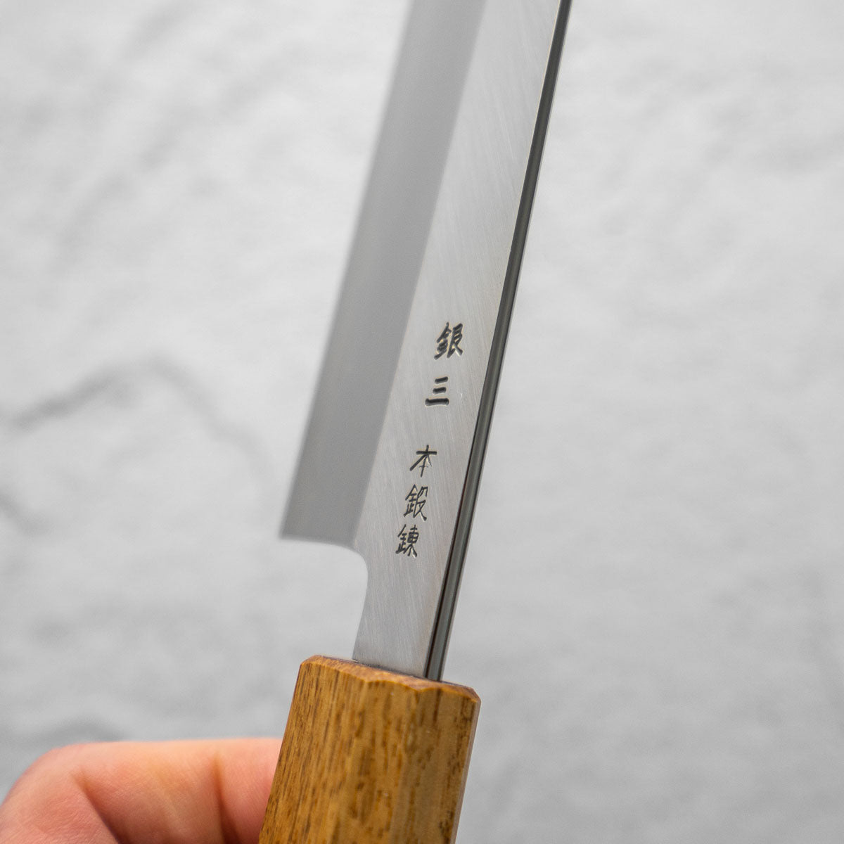 Japanese Ginsan steel, also known as Silver-3 or G3, is an underrated high-grade semi-stainless steel loved by many for being in the ‘goldilocks zone’ of knife steels. It holds a very respectable edge, but is effortless to sharpen. It is considered the semi-stainless version of White 2. It is the knife steel of choice for many home cooks and professional chefs alike.