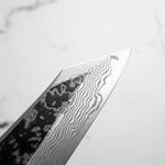 The Kiritsuke knife, a symbol of expertise in Japanese cuisine is similar to the Gyuto but has a flatter profile. This multi-purpose knife combines features of a slicer and a vegetable knife, with its angled tip and long blade. It excels in precise slicing, chopping, and julienning, making it a prestigious and versatile tool.