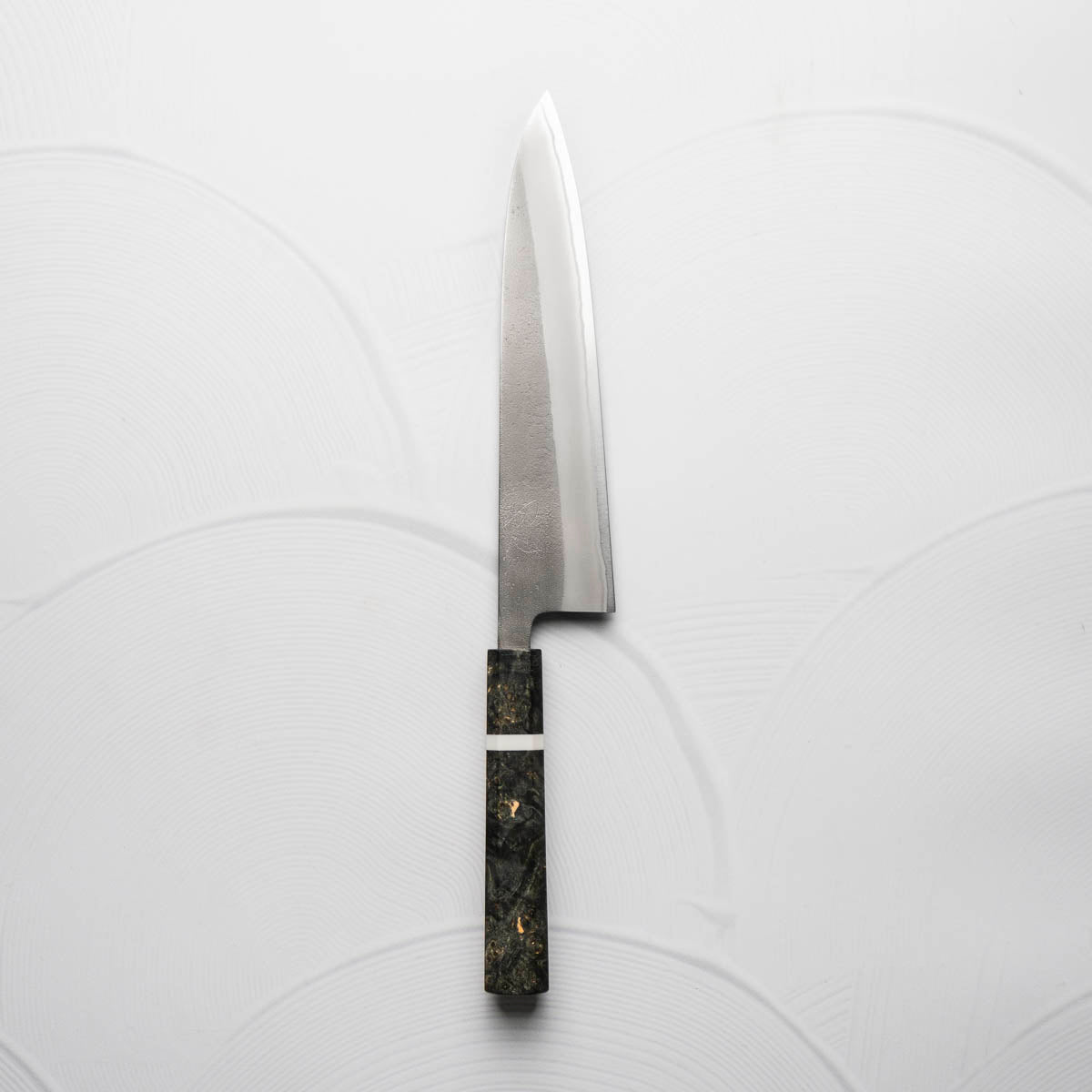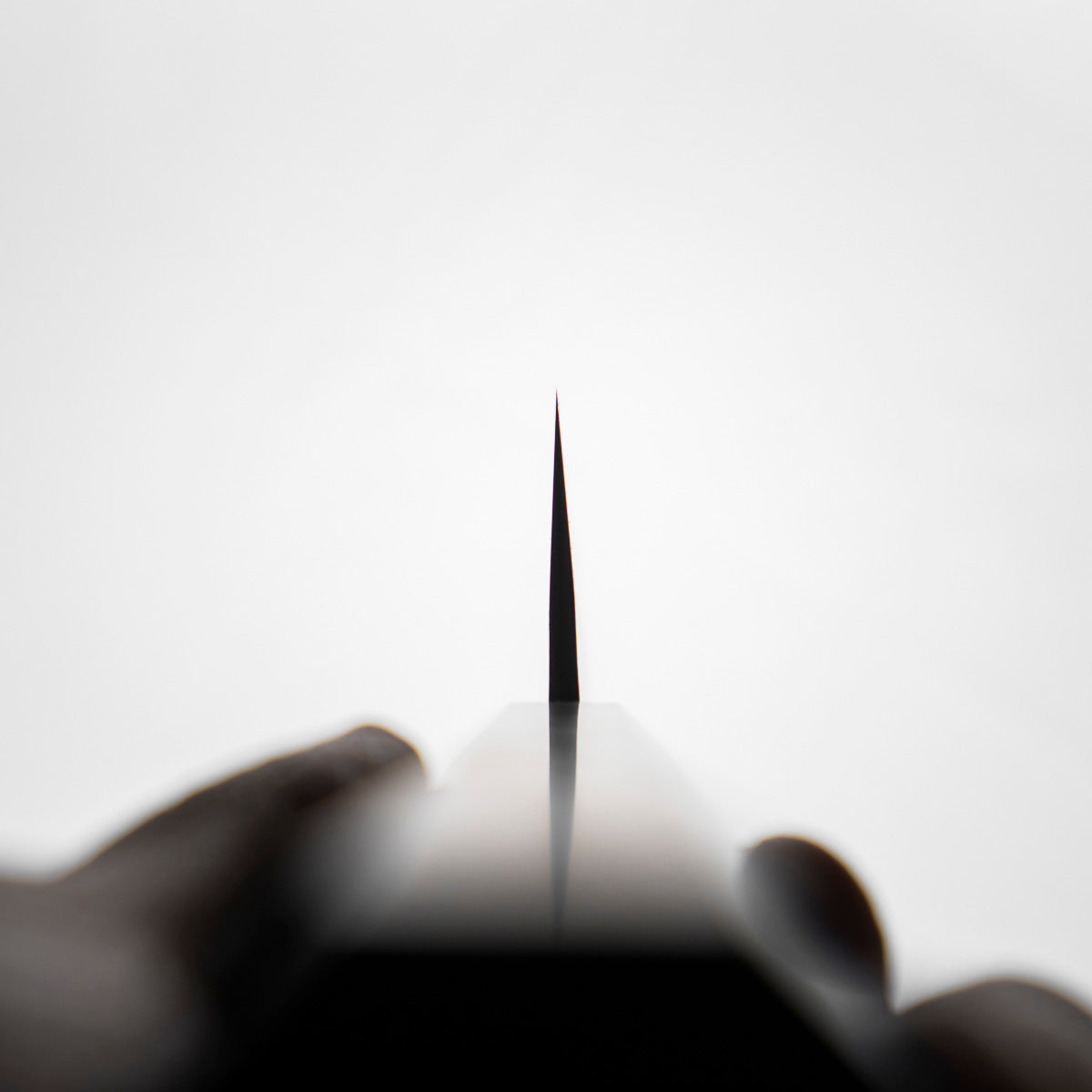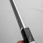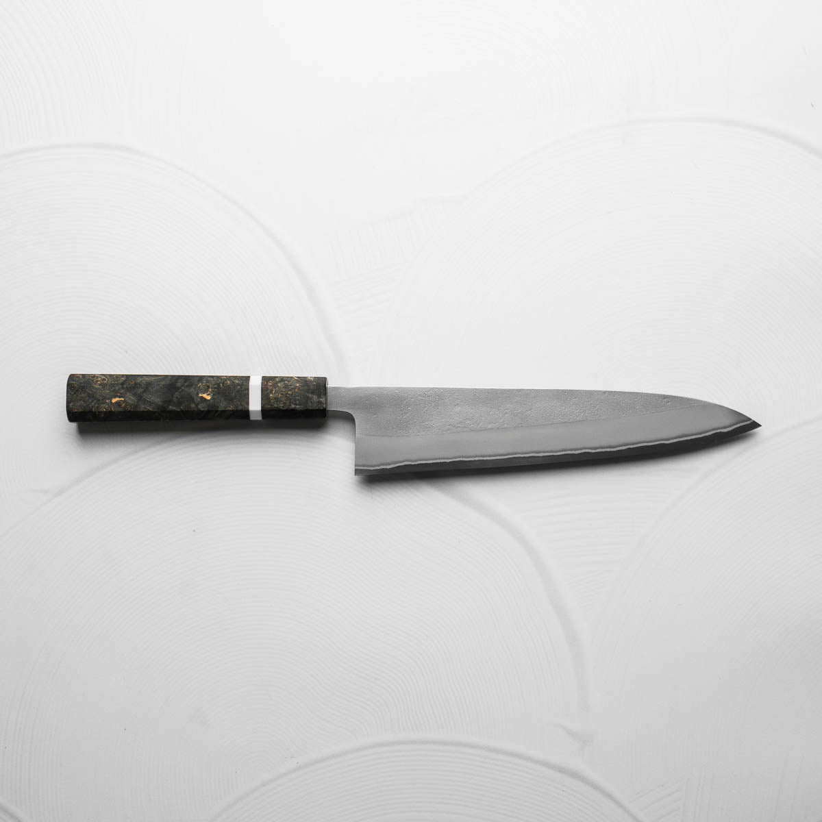 Japanese White Steel #2, a traditional high-carbon steel, is cherished for its purity and fine grain structure, enabling razor-sharp edges, at the cost of being reactive. It is one of the easiest steels to sharpen, but cannot be left wet for even short periods otherwise rust spots can occur. If you’re fastidious in your knife maintenance, this knife can steel can be extremely rewarding to use.