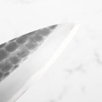 Japanese White Steel #2, a traditional high-carbon steel, is cherished for its purity and fine grain structure, enabling razor-sharp edges, at the cost of being reactive. It is one of the easiest steels to sharpen, but cannot be left wet for even short periods otherwise rust spots can occur. If you’re fastidious in your knife maintenance, this knife steel can be extremely rewarding to use.