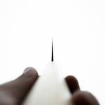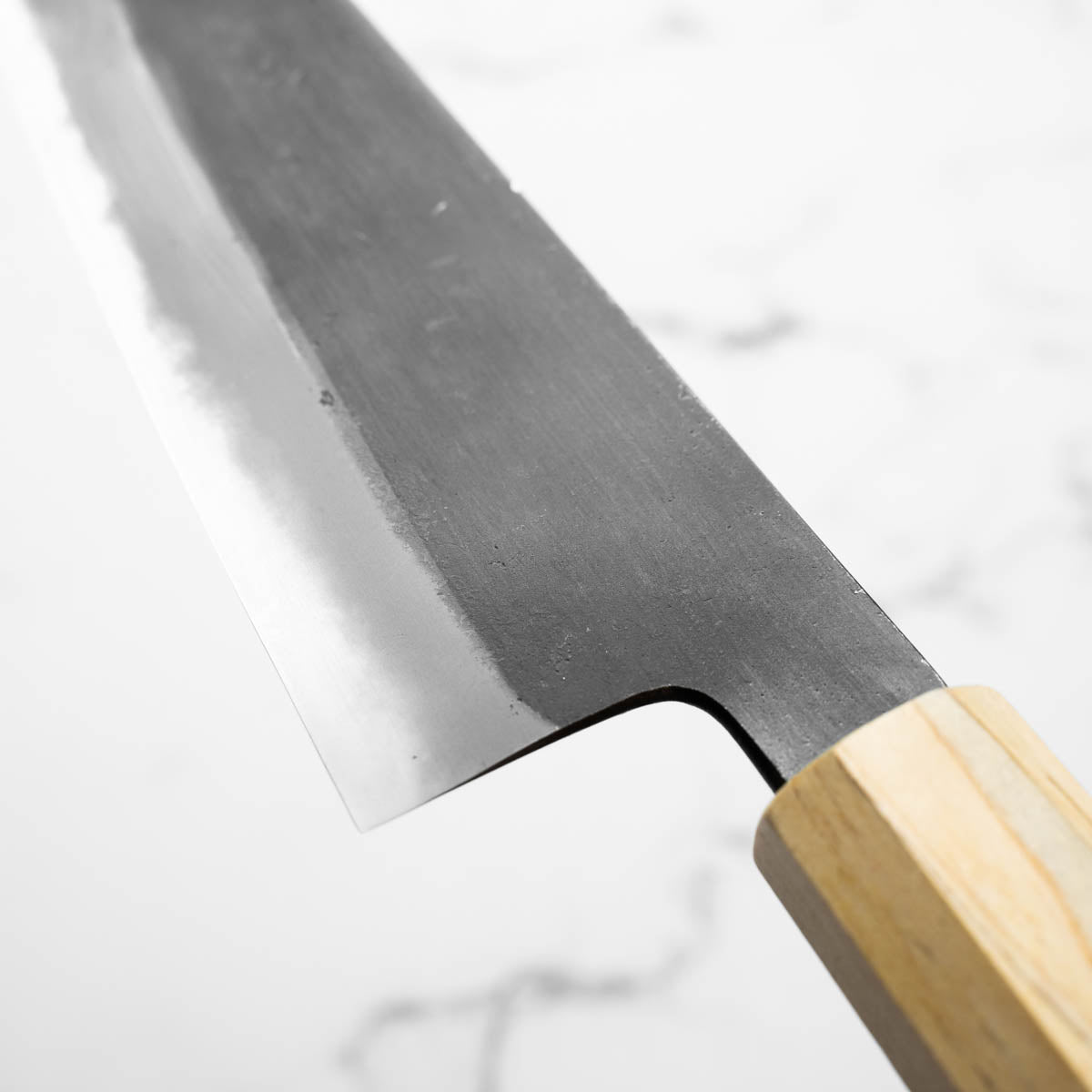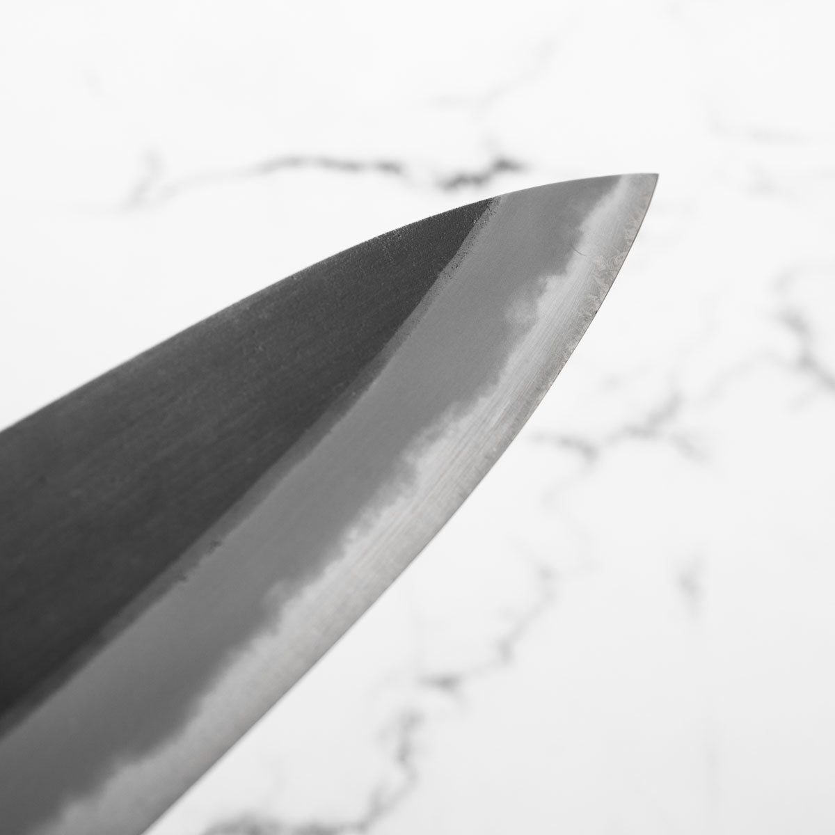 Japanese White Steel #2, a traditional high-carbon steel, is cherished for its purity and fine grain structure, enabling razor-sharp edges, at the cost of being reactive. It is one of the easiest steels to sharpen, but cannot be left wet for even short periods otherwise rust spots can occur. If you’re fastidious in your knife maintenance, this knife steel can be extremely rewarding to use.
