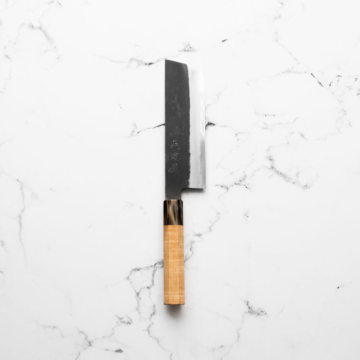 This knife is made from a high-carbon steel and as such, will require a little more care than a regular off-the-shelf knife. It must be dried shortly after use, as prolonged exposure to moisture can cause rust spots to appear. A very light coat of oil during storage also helps to prevent rust spots. A patina (colouration and seasoning of the steel) will occur with use.