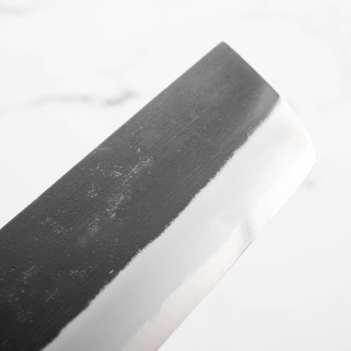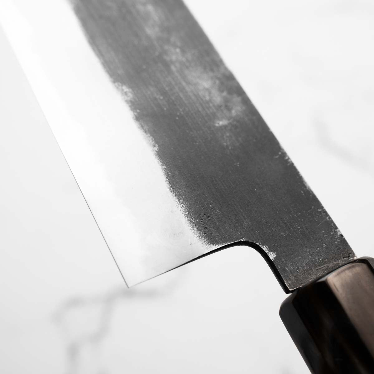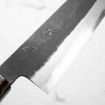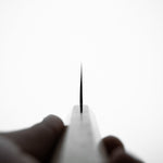Japanese White Steel #2, a traditional high-carbon steel, is cherished for its purity and fine grain structure, enabling razor-sharp edges, at the cost of being reactive. It is one of the easiest steels to sharpen, but cannot be left wet for even short periods otherwise rust spots can occur. If you’re fastidious in your knife maintenance, this knife steel can be extremely rewarding to use.
