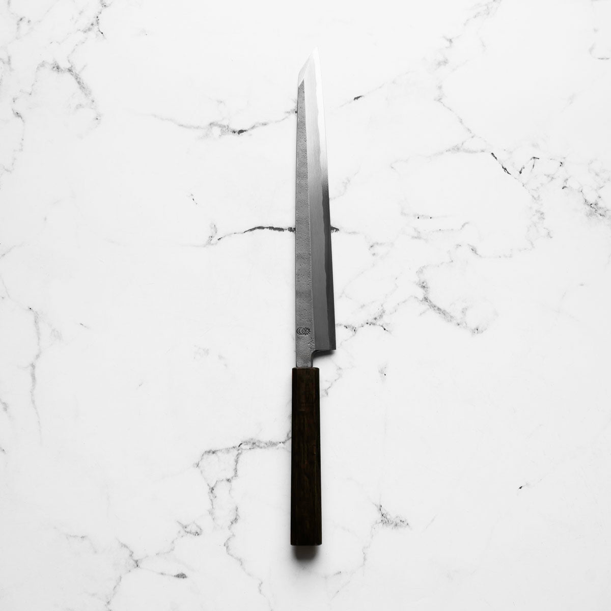 The Yanagiba knife, a staple in traditional Japanese cuisine, is a slender, long-bladed knife primarily used for slicing sashimi and sushi. Its graceful, single-beveled edge guarantees precise, thin cuts, preserving the texture and integrity of the fish. Revered for its sharpness and balance, the Yanagiba is essential for authentic Japanese food preparation.
