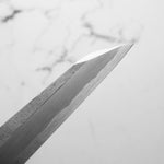 Japanese White Steel #2, a traditional high-carbon steel, is cherished for its purity and fine grain structure, enabling razor-sharp edges, at the cost of being reactive. It is one of the easiest steels to sharpen, but cannot be left wet for even short periods otherwise rust spots can occur. If you’re fastidious in your knife maintenance, this knife can steel can be extremely rewarding to use.