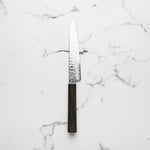 The Petty knife, a quintessential tool in Japanese cuisine, is a smaller utility knife used for precise, delicate tasks. Often considered a smaller sibling to the chef's knife, it excels in hand-held tasks like peeling, trimming, and intricate cutting. Its versatility makes it an essential for detailed culinary work.