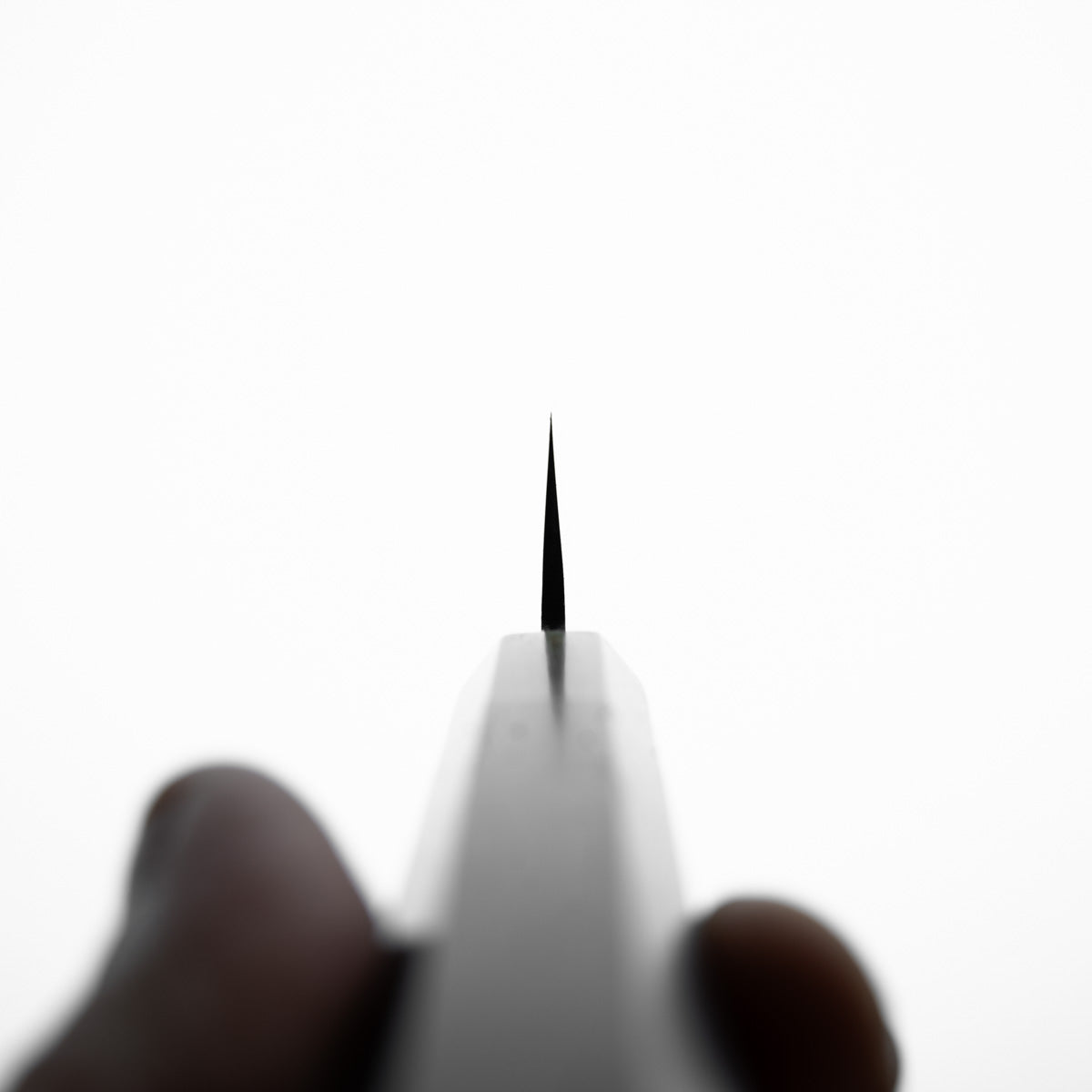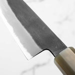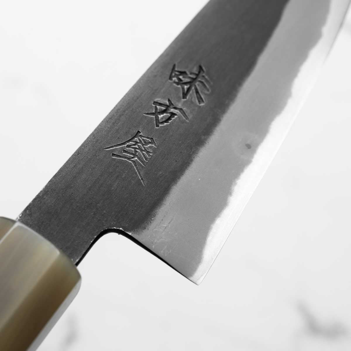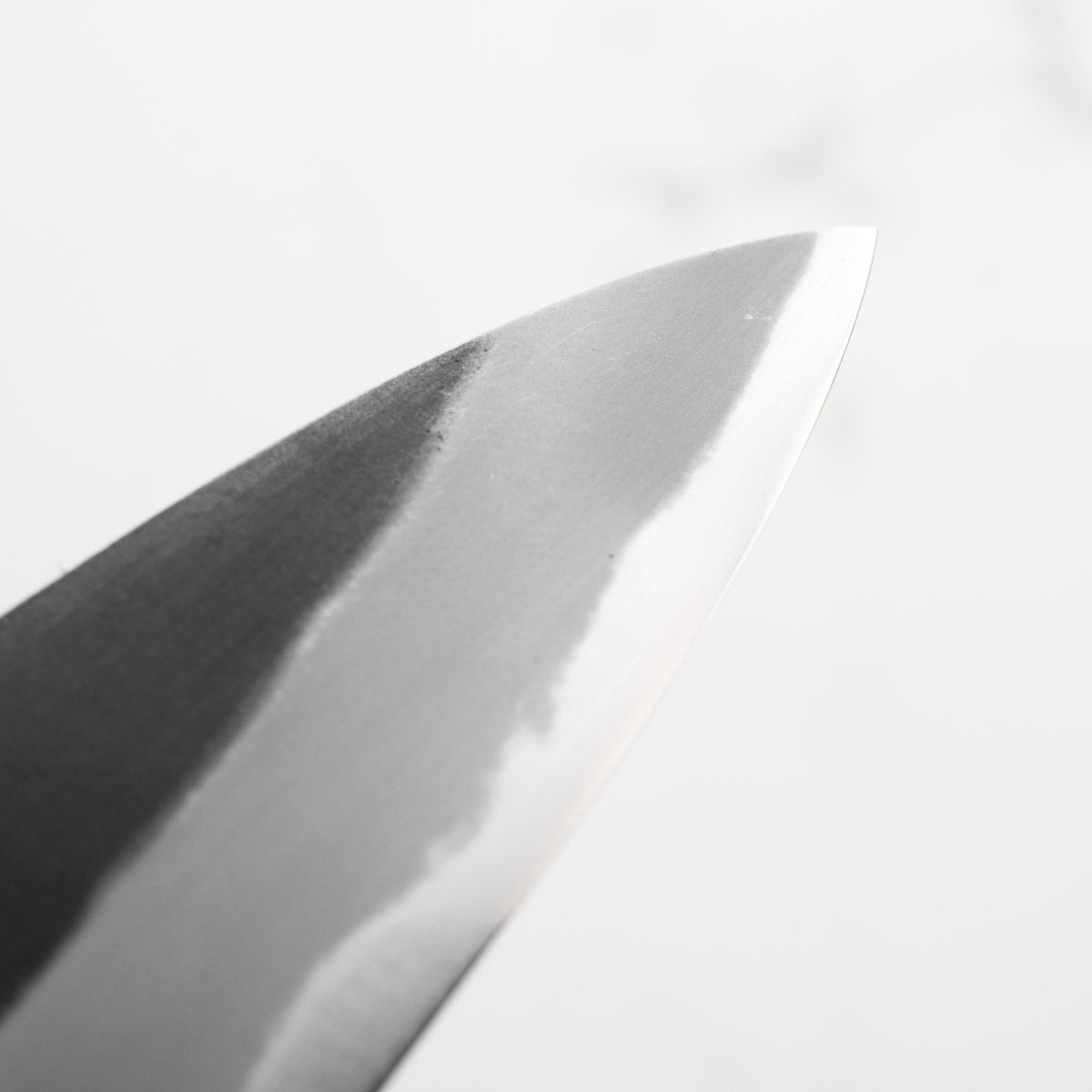 Japanese White Steel #2, a traditional high-carbon steel, is cherished for its purity and fine grain structure, enabling razor-sharp edges, at the cost of being reactive. It is one of the easiest steels to sharpen, but cannot be left wet for even short periods otherwise rust spots can occur. If you’re fastidious in your knife maintenance, this knife steel can be extremely rewarding to use.