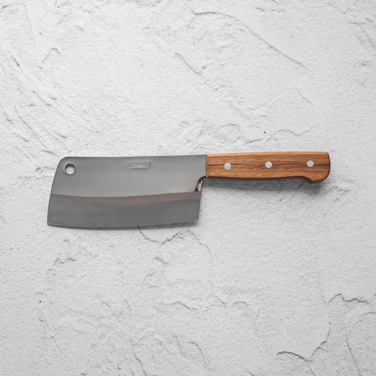 A Japanese butcher cleaver, distinct from its Western counterpart, is a specialized tool designed for precision meat cutting. It features a robust, wide blade adept at slicing through large cuts of meat and bones with ease and efficiency. This cleaver combines traditional Japanese craftsmanship with functionality, essential for professional butchery.