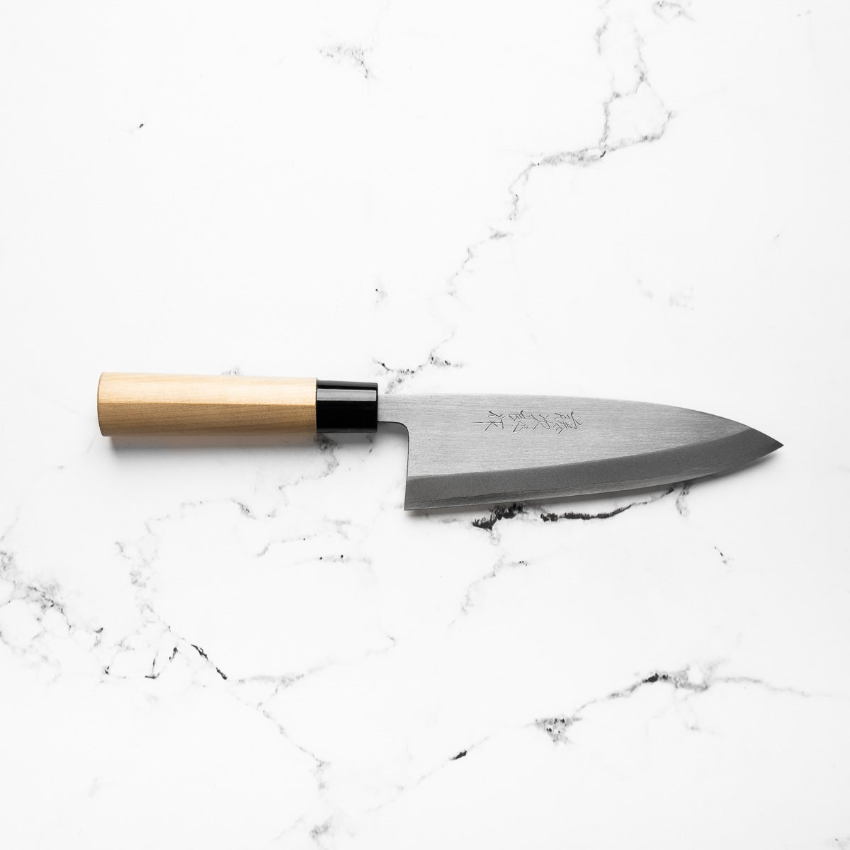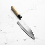The Deba knife, deeply rooted in Japanese culinary tradition, is a robust, single-bevel knife (sometimes double) primarily designed for fileting fish. Its thick, heavy blade effortlessly glides through fish bones and joints, while preserving delicate flesh. Ideal for seafood preparation, the Deba is a staple in Japanese kitchens for its precision and strength.