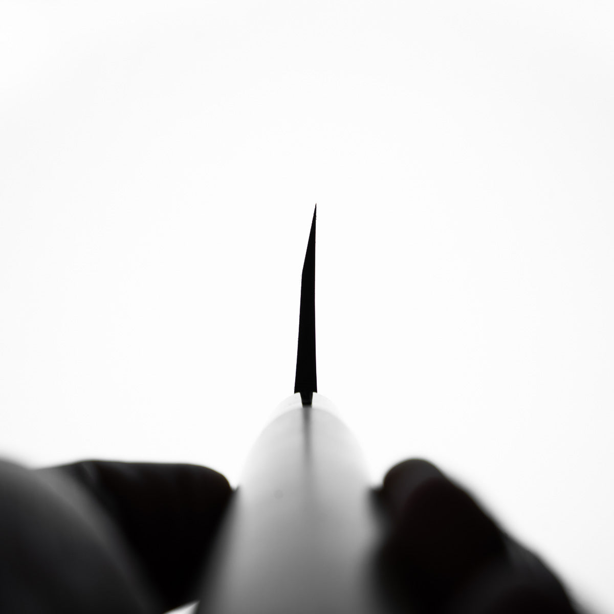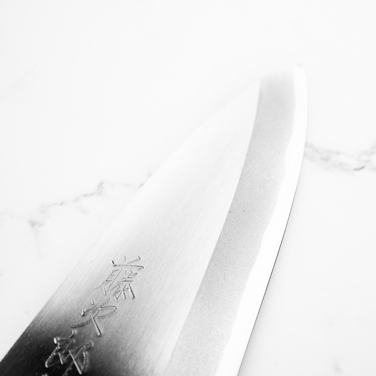 Japanese White Steel #2, a traditional high-carbon steel, is cherished for its purity and fine grain structure, enabling razor-sharp edges, at the cost of being reactive. It is one of the easiest steels to sharpen, but cannot be left wet for even short periods otherwise rust spots can occur. If you’re fastidious in your knife maintenance, this knife steel can be extremely rewarding to use.