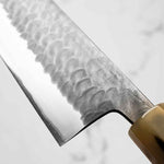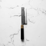 Japanese White Steel #2, a traditional high-carbon steel, is cherished for its purity and fine grain structure, enabling razor-sharp edges, at the cost of being reactive. It is one of the easiest steels to sharpen, but cannot be left wet for even short periods otherwise rust spots can occur. If you’re fastidious in your knife maintenance, this knife steel can be extremely rewarding to use.