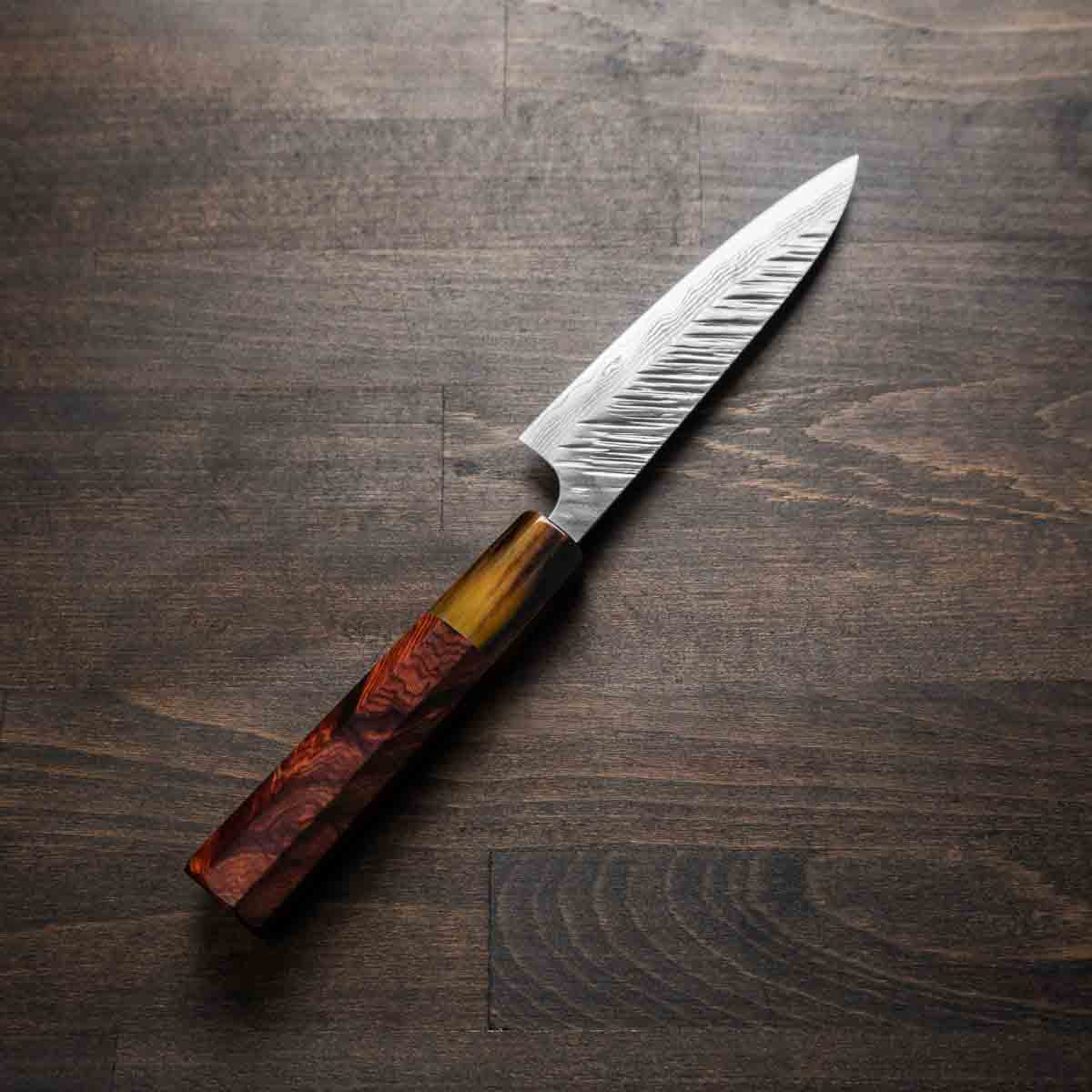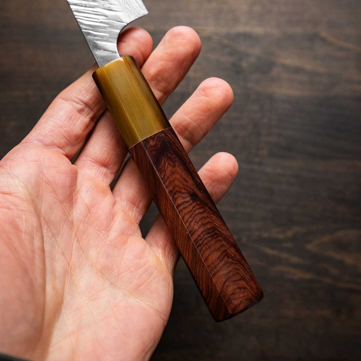 His knives are instantly recognizable for their striking Tsuchime and Suminagashi finishes, thin grinds, and use of high-performance steels such as SG2, HAP40, and stainless-clad Blue Super. Kurosaki’s Fujin series, with its dramatic wind-patterned hammer finish, helped cement his reputation as a blacksmith who blends artistry and technical brilliance in equal measure.