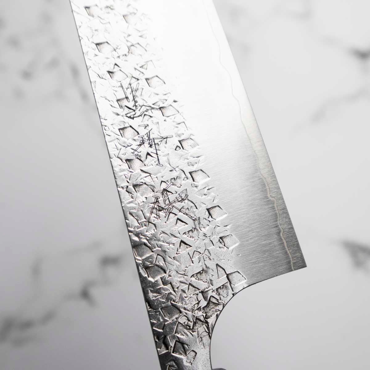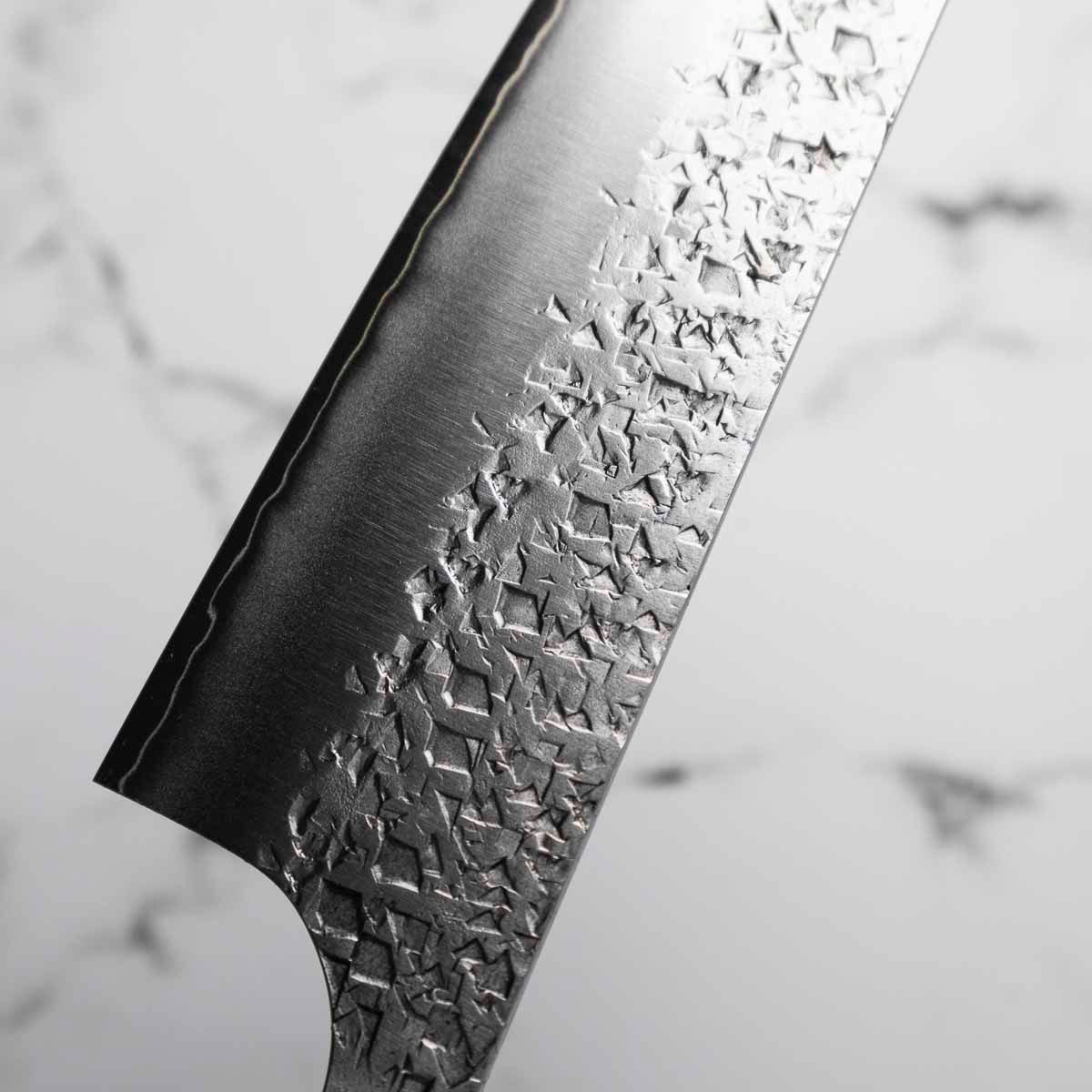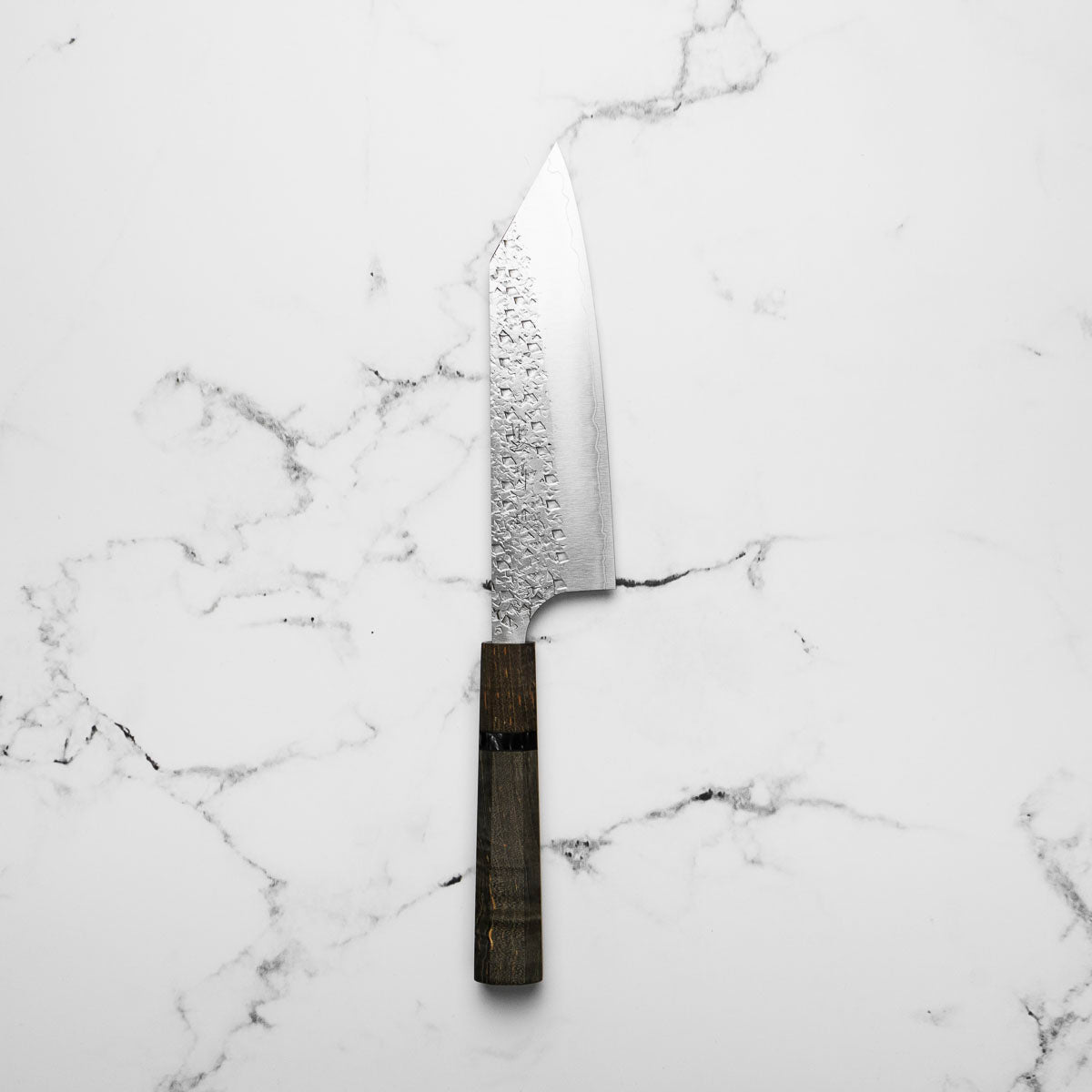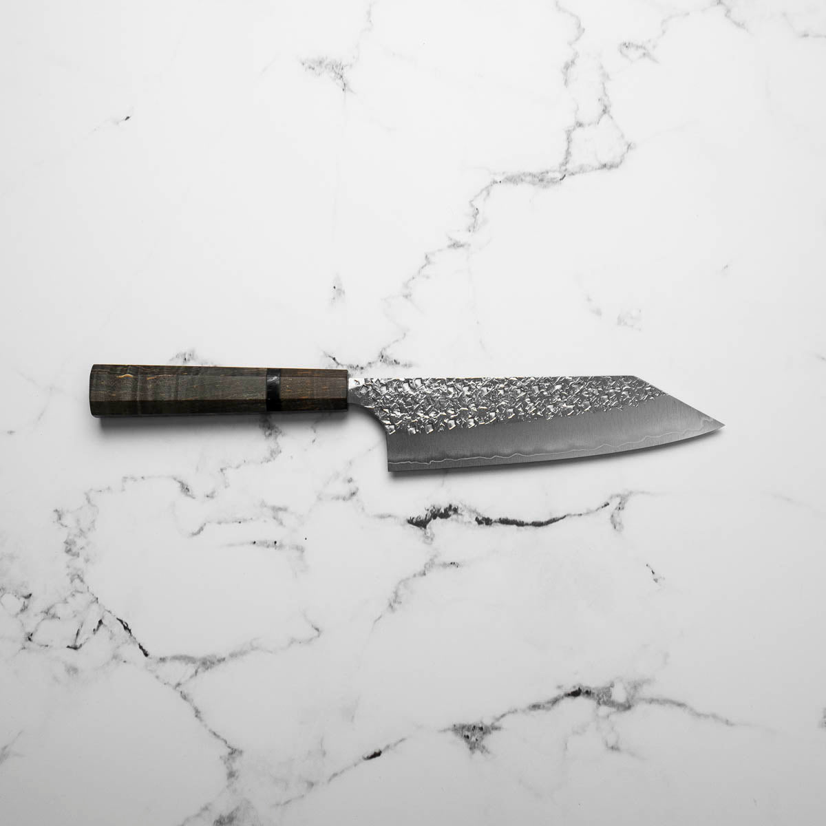 His knives are instantly recognizable for their striking Tsuchime and Suminagashi finishes, thin grinds, and use of high-performance steels such as SG2, HAP40, and stainless-clad Blue Super. Kurosaki’s Fujin series, with its dramatic wind-patterned hammer finish, helped cement his reputation as a blacksmith who blends artistry and technical brilliance in equal measure.