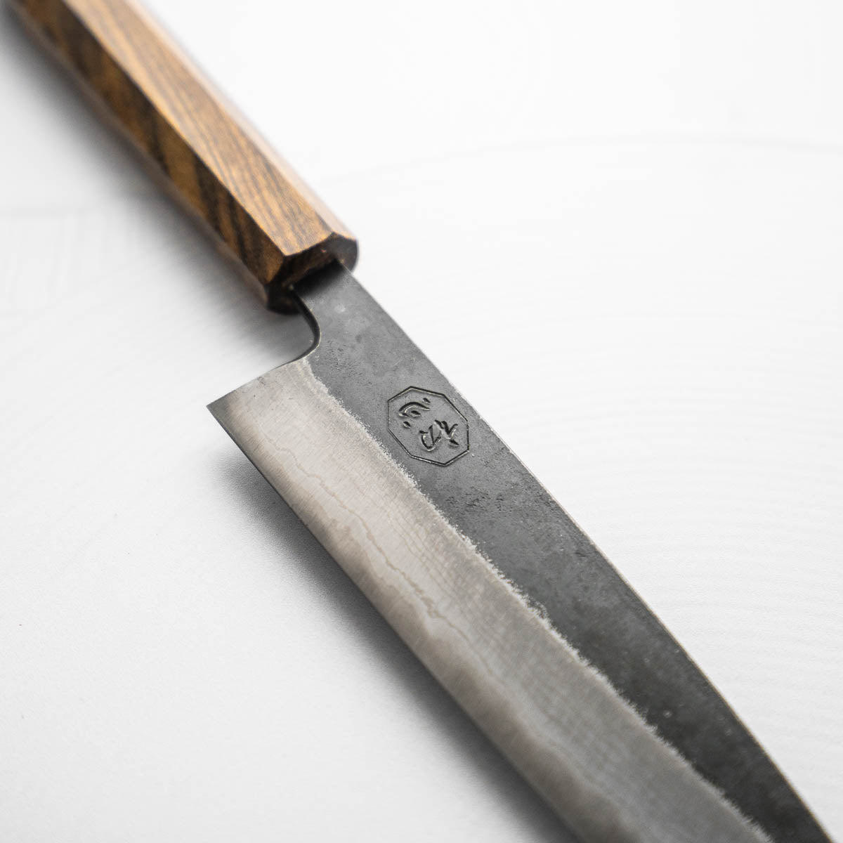 Got this petty about two weeks ago, been using it every day at work, it comes out of the box ridiculously sharp, stays that way with a bit of honing every other day. SUPER thin behind the edge. Used it to slice some sizable Mac nuts the other day at work and it had no problem making clean cuts through them. The factory patina on this knife is also incredible. Haven’t had to worry about rusting or flash rust at all, even when left out for a minute or two.