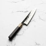 The Petty knife, a quintessential tool in Japanese cuisine, is a smaller utility knife used for precise, delicate tasks. Often considered a smaller sibling to the chef's knife, it excels in hand-held tasks like peeling, trimming, and intricate cutting. Its versatility makes it an essential for detailed culinary work.