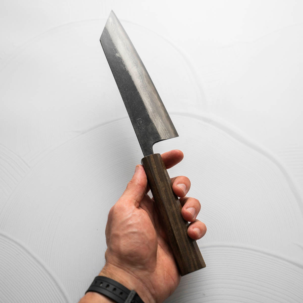 This knife is made from a high-carbon steel and as such, will require a little more care than a regular off-the-shelf knife. It must be dried shortly after use, as prolonged exposure to moisture can cause rust spots to appear. A very light coat of oil during storage also helps to prevent rust spots. A patina (colouration and seasoning of the steel) will occur with use.