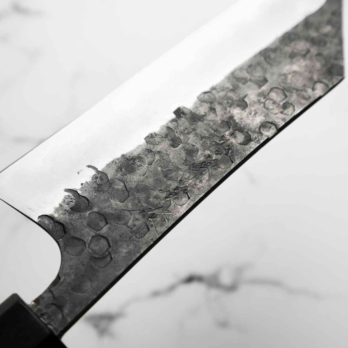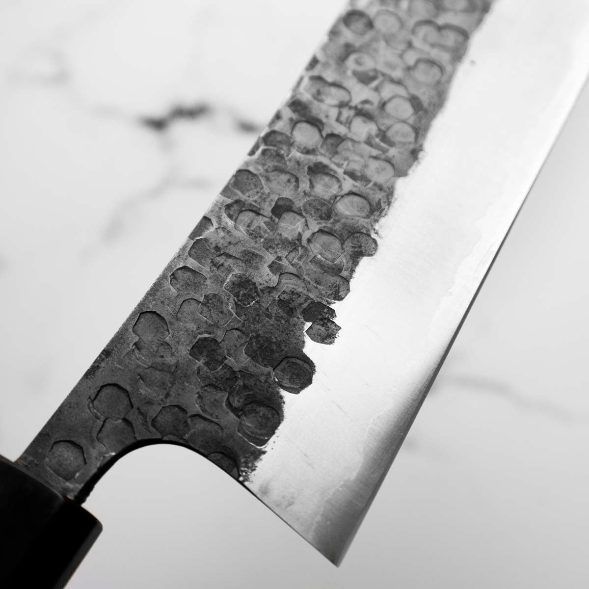 I’m a huge fan of taller blades. One of my favorite choppers is a tall nakiri from moritaka. Now, this knife isn’t as tall.. but it is nice and heavy. I was surprised at how big the koba is, but the knife is fairly thin but I can’t wait to thin it and polish the bevel.. but because of the stainless cladding, polishing might be hard to do. But at least the cladding brings convenience to the use of the knife. I’m always a fan of the tsuchime patterns of Matsubara. His work is always gorgeous