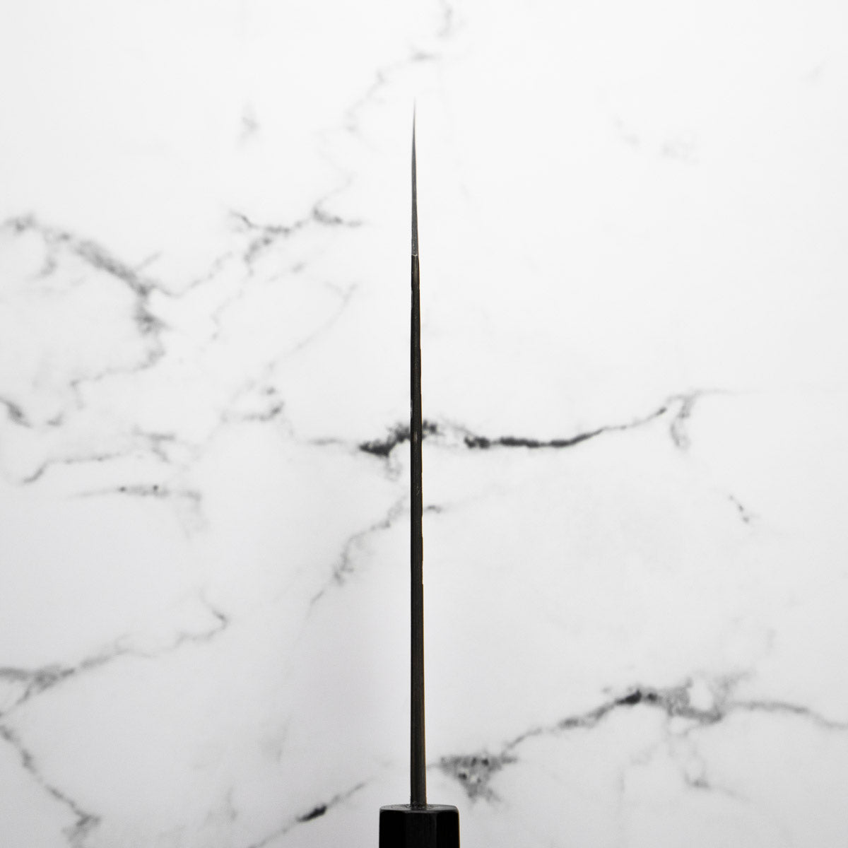 This knife is made from a high-carbon steel and as such, will require a little more care than a regular off-the-shelf knife. It must be dried shortly after use, as prolonged exposure to moisture can cause rust spots to appear. A very light coat of oil during storage also helps to prevent rust spots. A patina (colouration and seasoning of the steel) will occur with use.