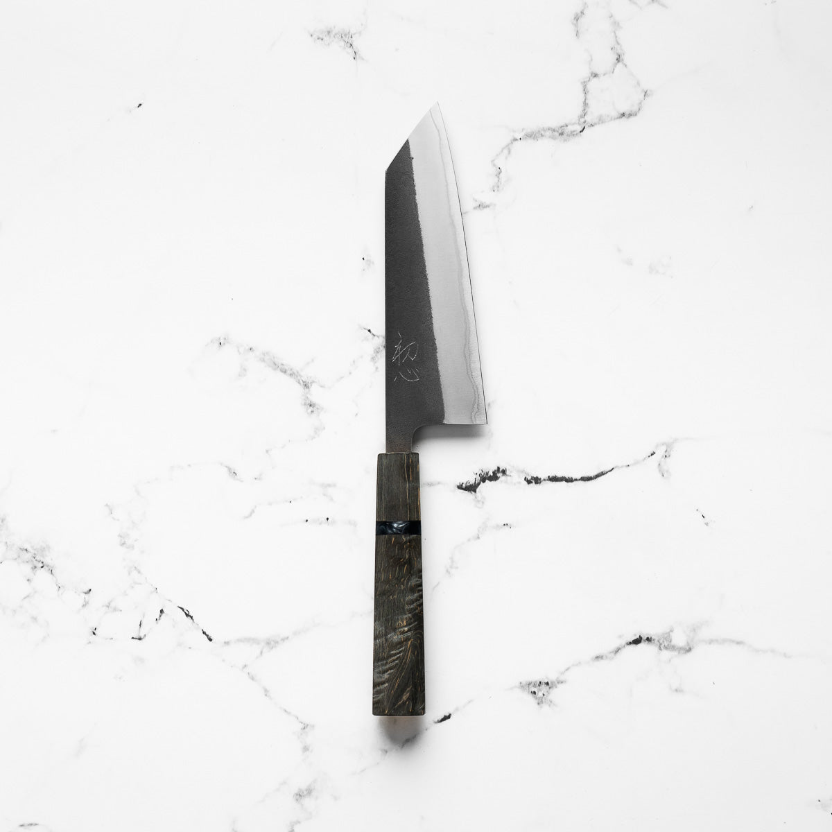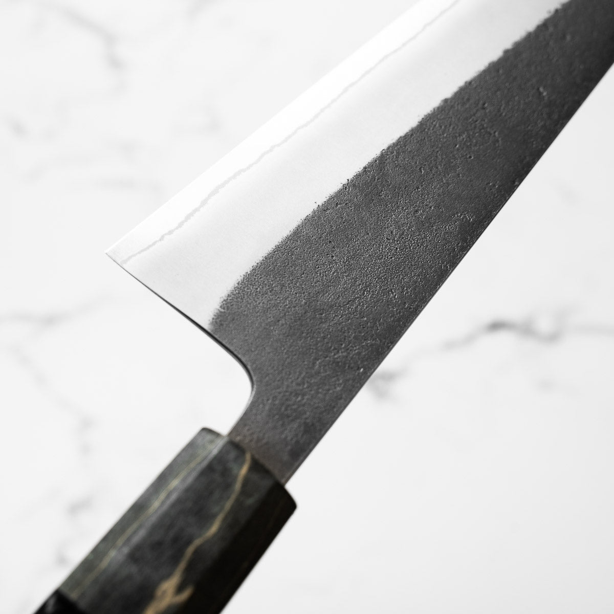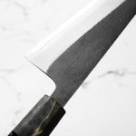 One of their most celebrated offerings is the SKD steel series — featuring a semi-stainless high-carbon core clad in stainless steel. The blades showcase a distinctive wide-bevel grind with a shallow hammer texture that sits stylistically between nashiji and kurouchi finishes. Paired with traditional burnt chestnut handles, each knife reflects Yoshikane’s dedication to consistency, craftsmanship, and timeless design.