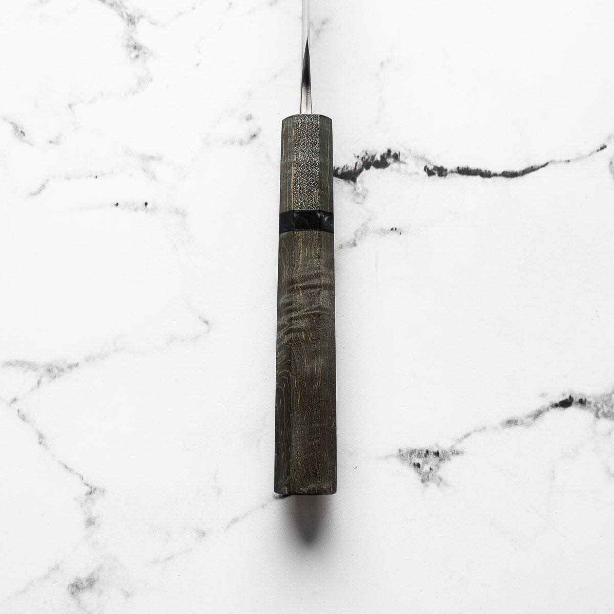 Japanese White Steel #2, a traditional high-carbon steel, is cherished for its purity and fine grain structure, enabling razor-sharp edges, at the cost of being reactive. It is one of the easiest steels to sharpen, but cannot be left wet for even short periods otherwise rust spots can occur. If you’re fastidious in your knife maintenance, this knife steel can be extremely rewarding to use.