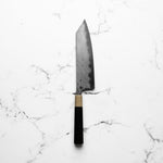 The Kiritsuke knife, a symbol of expertise in Japanese cuisine, is traditionally used by executive chefs. This multi-purpose knife combines features of a slicer and a vegetable knife, with its angled tip and long blade. It excels in precise slicing, chopping, and julienning, making it a prestigious and versatile tool.