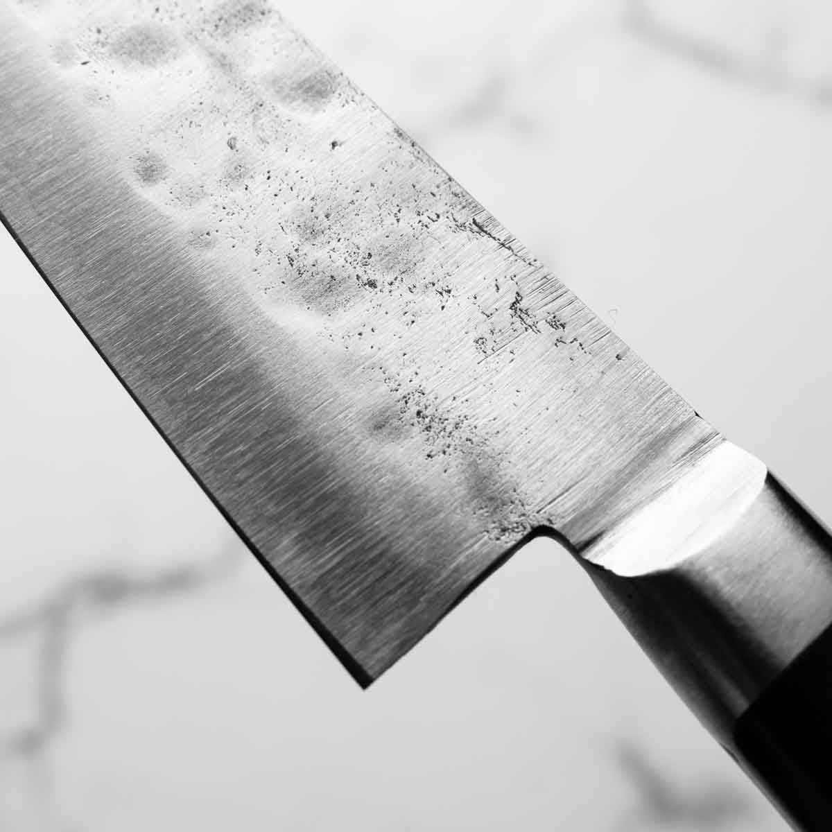 This knife is made from a high-carbon steel and as such, will require a little more care than a regular off-the-shelf knife. It must be dried shortly after use, as prolonged exposure to moisture can cause rust spots to appear. A very light coat of oil during storage also helps to prevent rust spots. A patina (colouration and seasoning of the steel) will occur with use.
