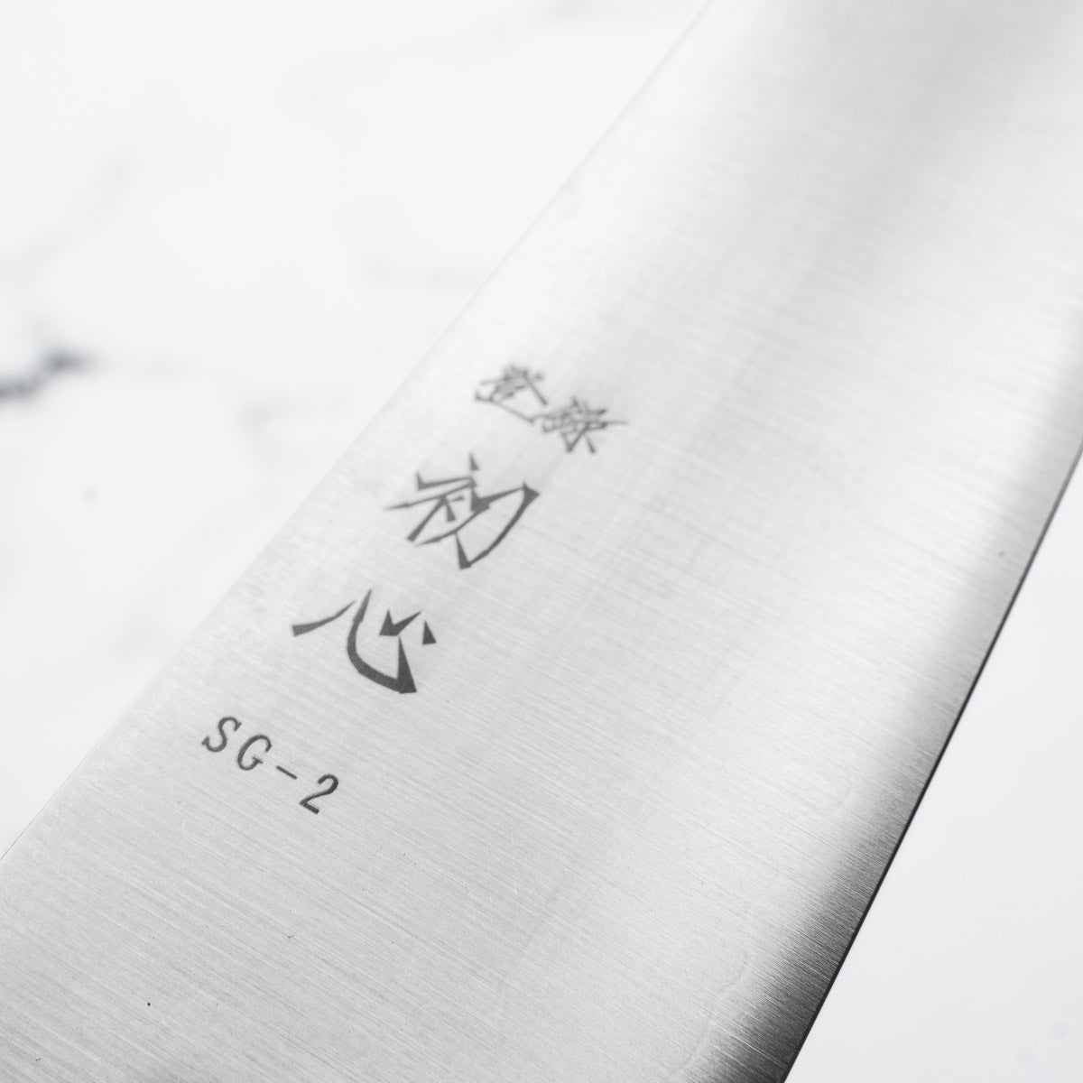 SG2 is considered by many as the best knifemaking steel in Japan. It gives all the benefits of carbon steel (very long edge retention, general ease of sharpening) without the carbon steel stresses of maintenance. It'll hold an edge for a long time, and can quickly and easily be refreshed on a whetstone or ceramic honing steel.