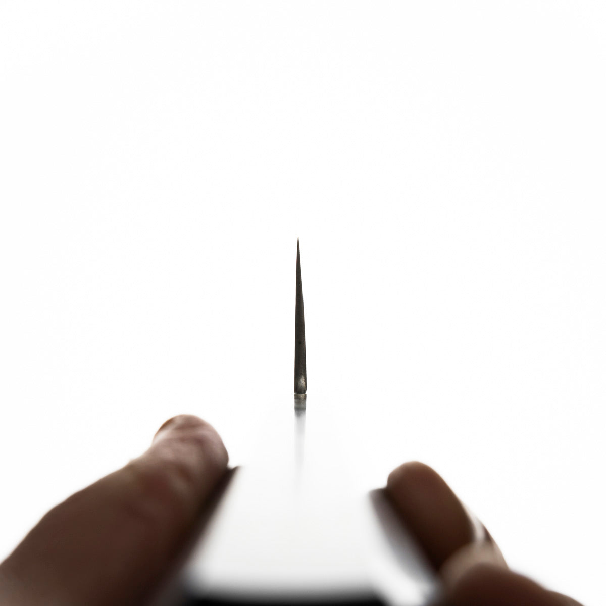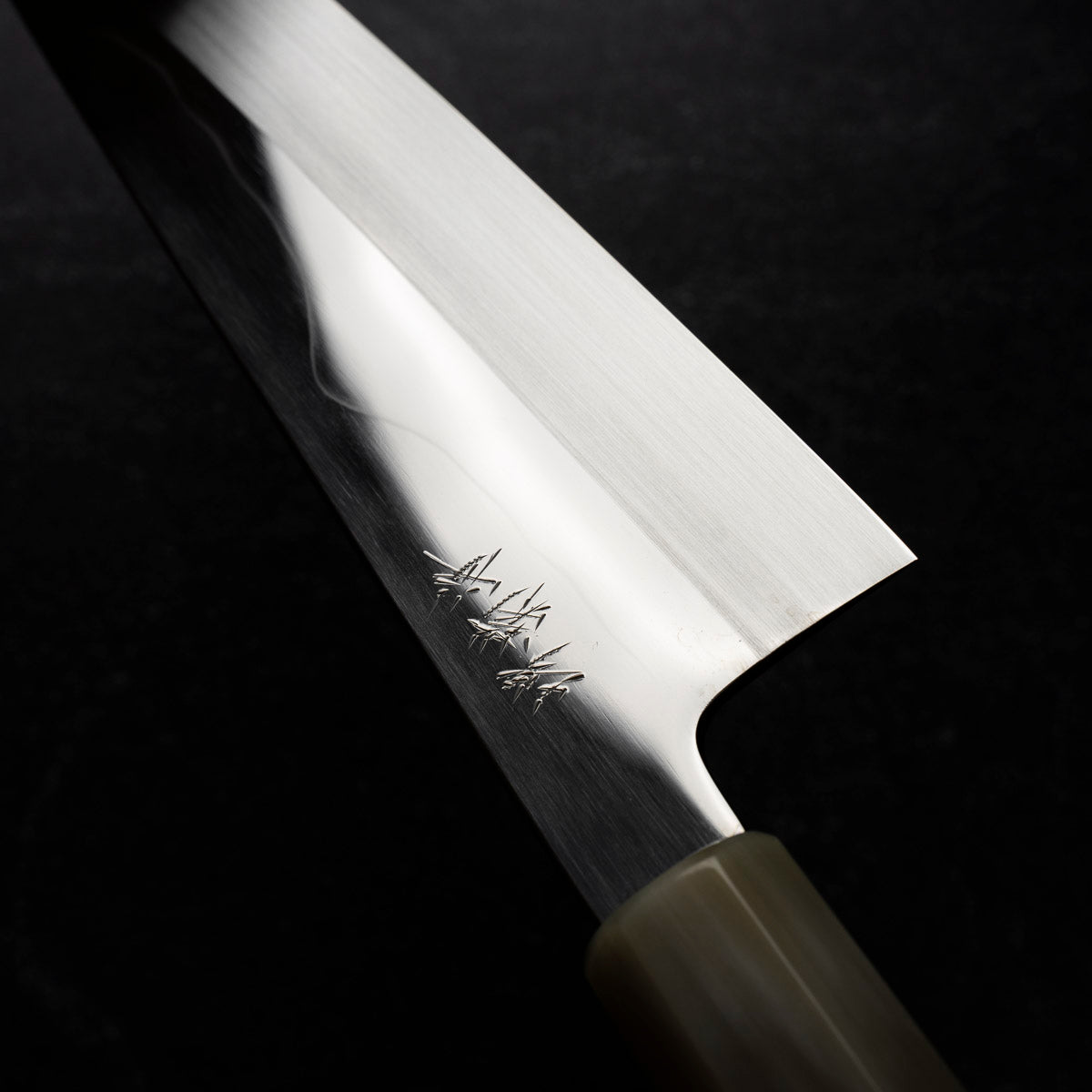 Japanese White Steel #2, a traditional high-carbon steel, is cherished for its purity and fine grain structure, enabling razor-sharp edges, at the cost of being reactive. It is one of the easiest steels to sharpen, but cannot be left wet for even short periods otherwise rust spots can occur. If you’re fastidious in your knife maintenance, this knife steel can be extremely rewarding to use.