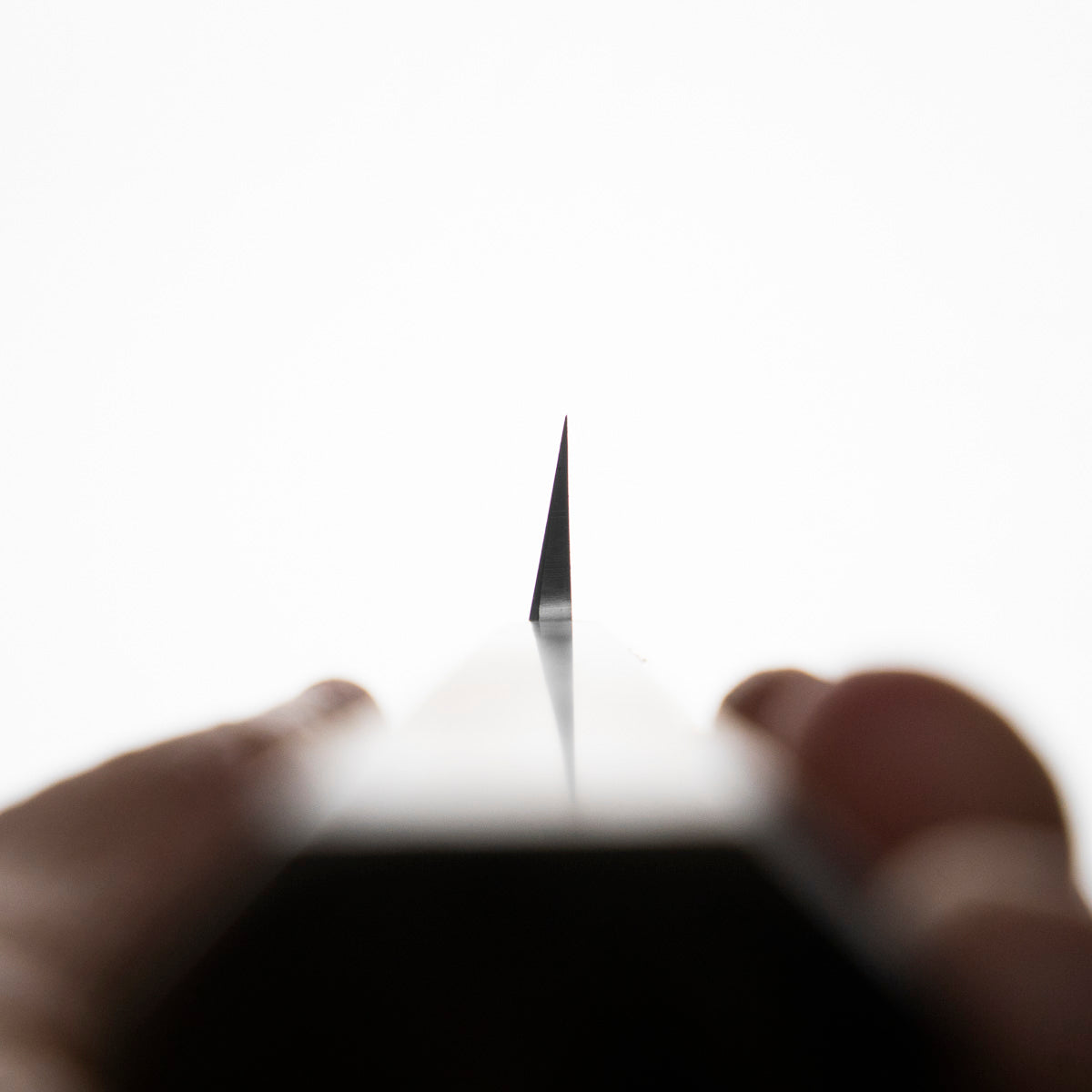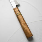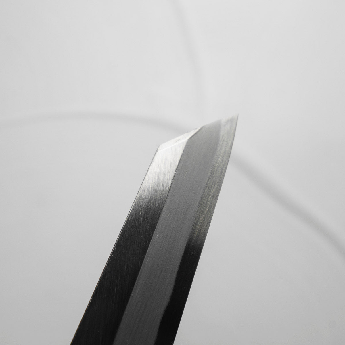Japanese White Steel #2, a traditional high-carbon steel, is cherished for its purity and fine grain structure, enabling razor-sharp edges, at the cost of being reactive. It is one of the easiest steels to sharpen, but cannot be left wet for even short periods otherwise rust spots can occur. If you’re fastidious in your knife maintenance, this knife steel can be extremely rewarding to use.