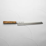 The Yanagiba knife, a staple in traditional Japanese cuisine, is a slender, long-bladed knife primarily used for slicing sashimi and sushi. Its graceful, single-beveled edge guarantees precise, thin cuts, preserving the texture and integrity of the fish. Revered for its sharpness and balance, the Yanagiba is essential for authentic Japanese food preparation.