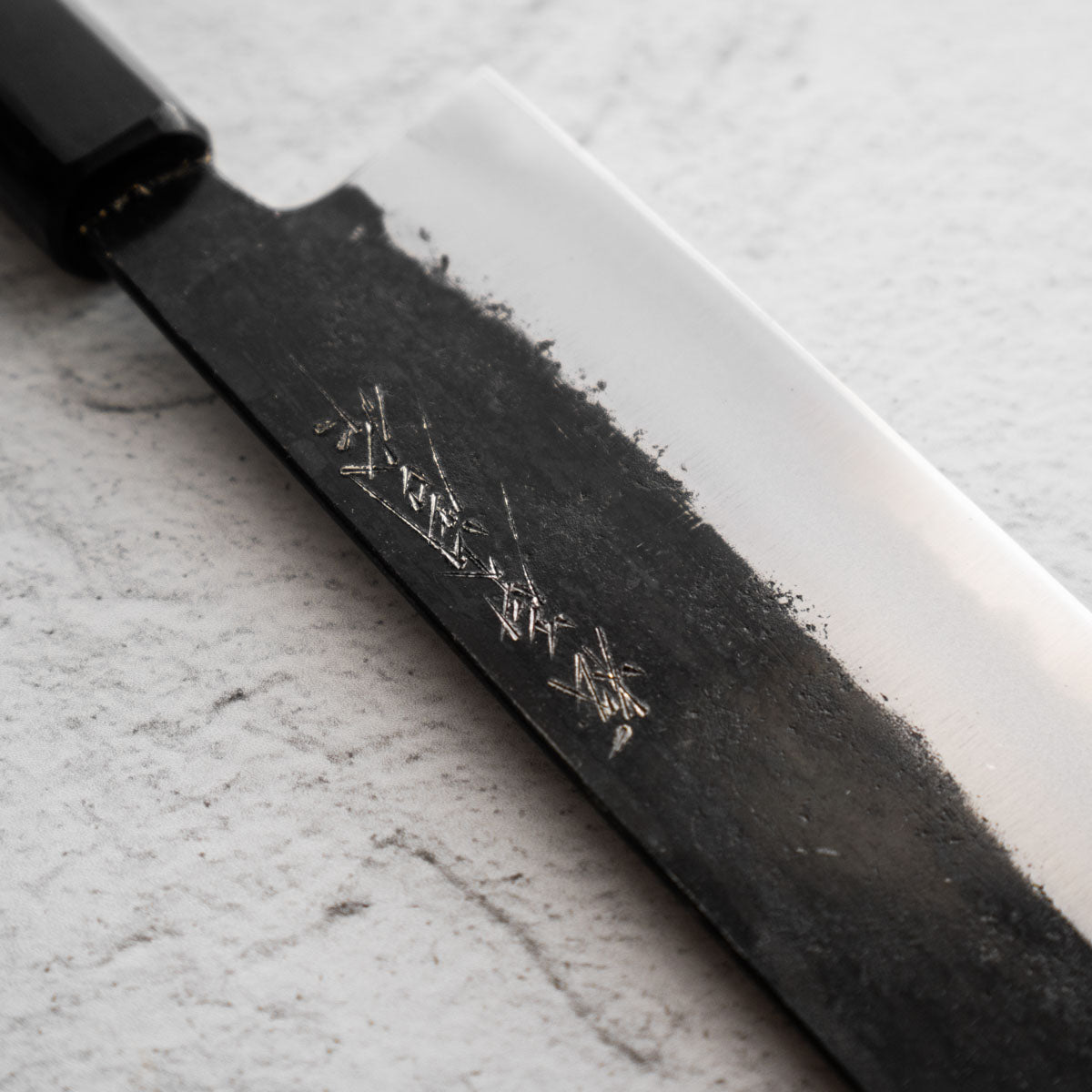 This knife is made from a high-carbon steel and as such, will require a little more care than a regular off-the-shelf knife. It must be dried shortly after use, as prolonged exposure to moisture can cause rust spots to appear. A very light coat of oil during storage also helps to prevent rust spots. A patina (colouration and seasoning of the steel) will occur with use.