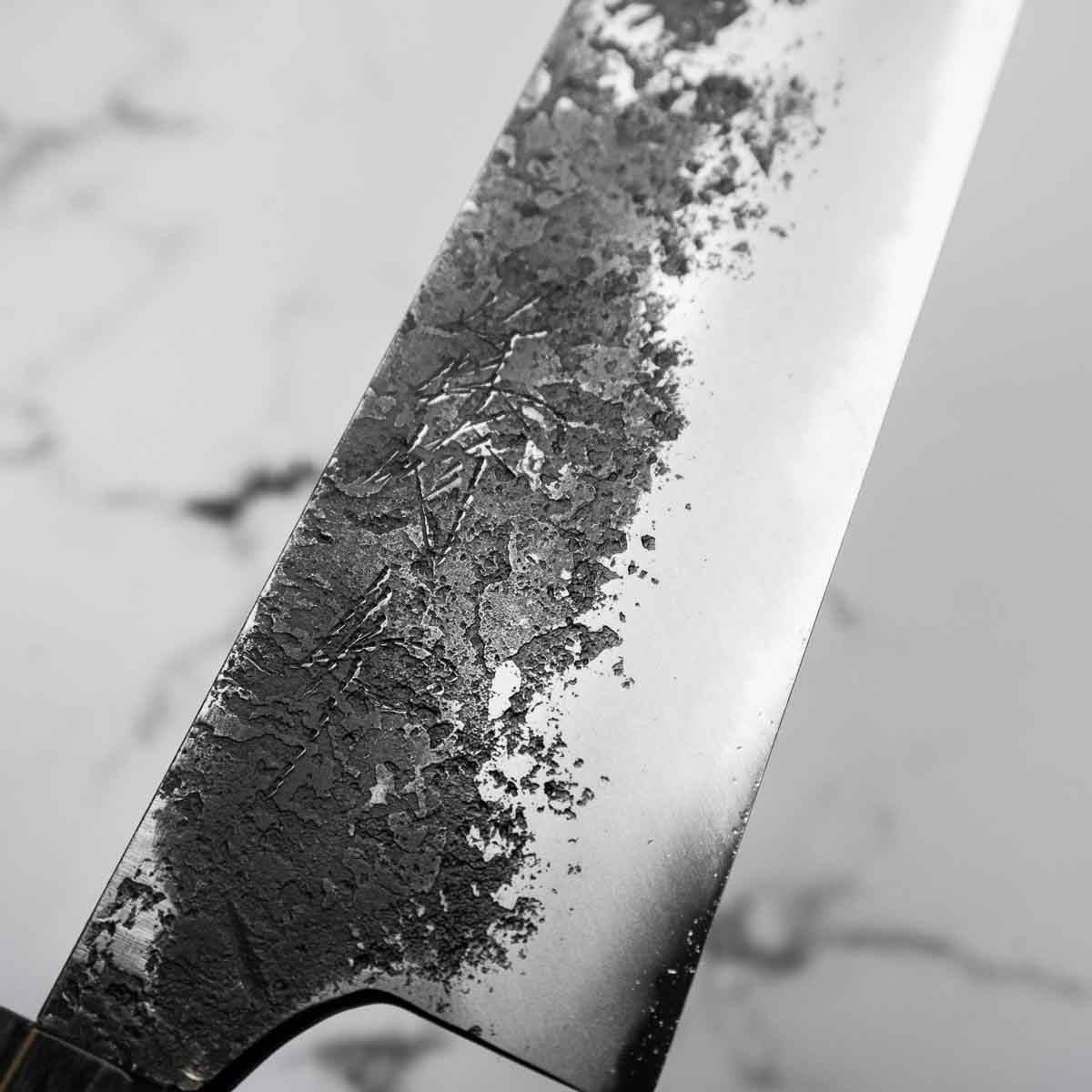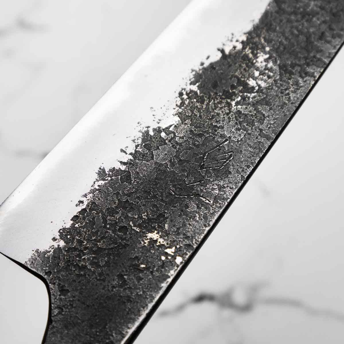 Japanese White Steel #2, a traditional high-carbon steel, is cherished for its purity and fine grain structure, enabling razor-sharp edges, at the cost of being reactive. It is one of the easiest steels to sharpen, but cannot be left wet for even short periods otherwise rust spots can occur. If you’re fastidious in your knife maintenance, this knife steel can be extremely rewarding to use.