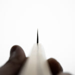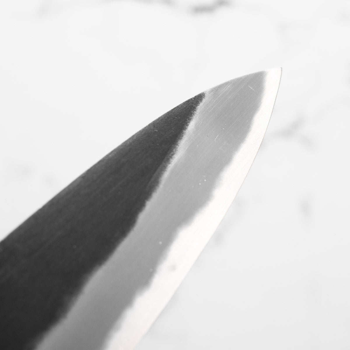 Japanese White Steel #2, a traditional high-carbon steel, is cherished for its purity and fine grain structure, enabling razor-sharp edges, at the cost of being reactive. It is one of the easiest steels to sharpen, but cannot be left wet for even short periods otherwise rust spots can occur. If you’re fastidious in your knife maintenance, this knife steel can be extremely rewarding to use.