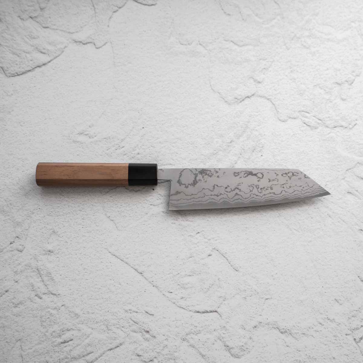 Japanese White Steel #2, a traditional high-carbon steel, is cherished for its purity and fine grain structure, enabling razor-sharp edges, at the cost of being reactive. It is one of the easiest steels to sharpen, but cannot be left wet for even short periods otherwise rust spots can occur. If you’re fastidious in your knife maintenance, this knife steel can be extremely rewarding to use.