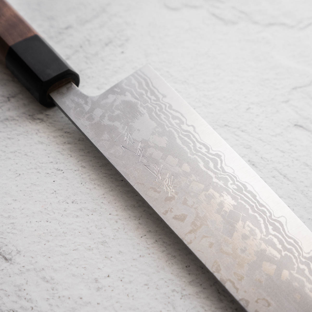 Japanese White Steel #2, a traditional high-carbon steel, is cherished for its purity and fine grain structure, enabling razor-sharp edges, at the cost of being reactive. It is one of the easiest steels to sharpen, but cannot be left wet for even short periods otherwise rust spots can occur. If you’re fastidious in your knife maintenance, this knife steel can be extremely rewarding to use.