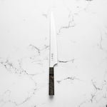 The Sujihiki knife, a traditional Japanese slicer, is designed for carving and fileting. With its long, narrow blade, typically ranging from 240mm to 330mm, it excels in creating clean, smooth cuts through meat and fish. Its length ensures long, uninterrupted strokes, making it perfect for precise slicing tasks.
