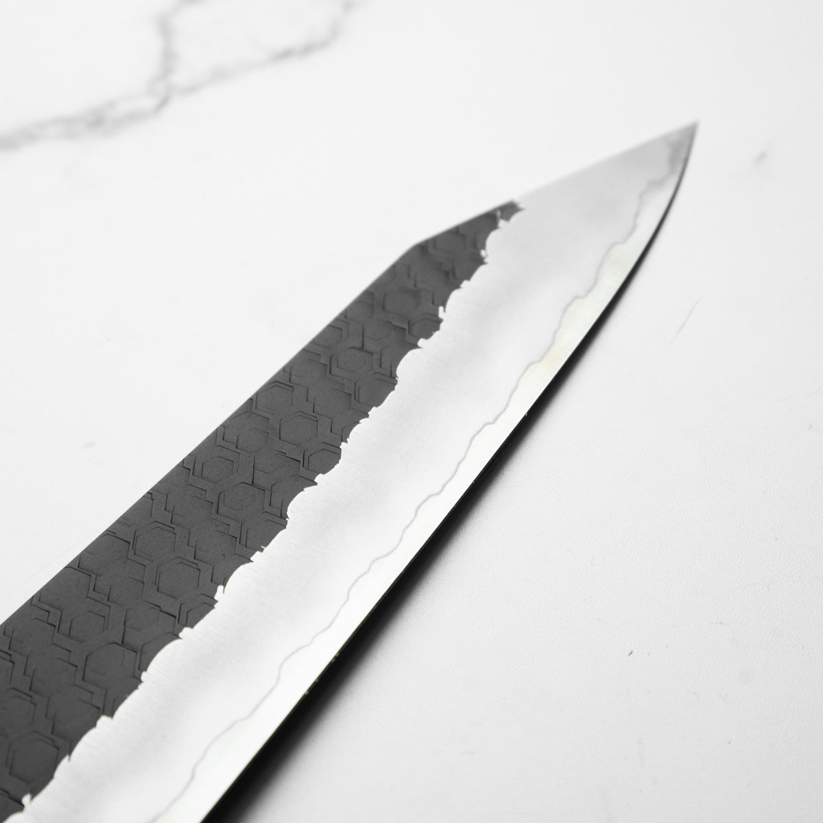 The Sujihiki knife, a traditional Japanese slicer, is designed for carving and fileting. With its long, narrow blade, typically ranging from 240mm to 330mm, it excels in creating clean, smooth cuts through meat and fish. Its length ensures long, uninterrupted strokes, making it perfect for precise slicing tasks.