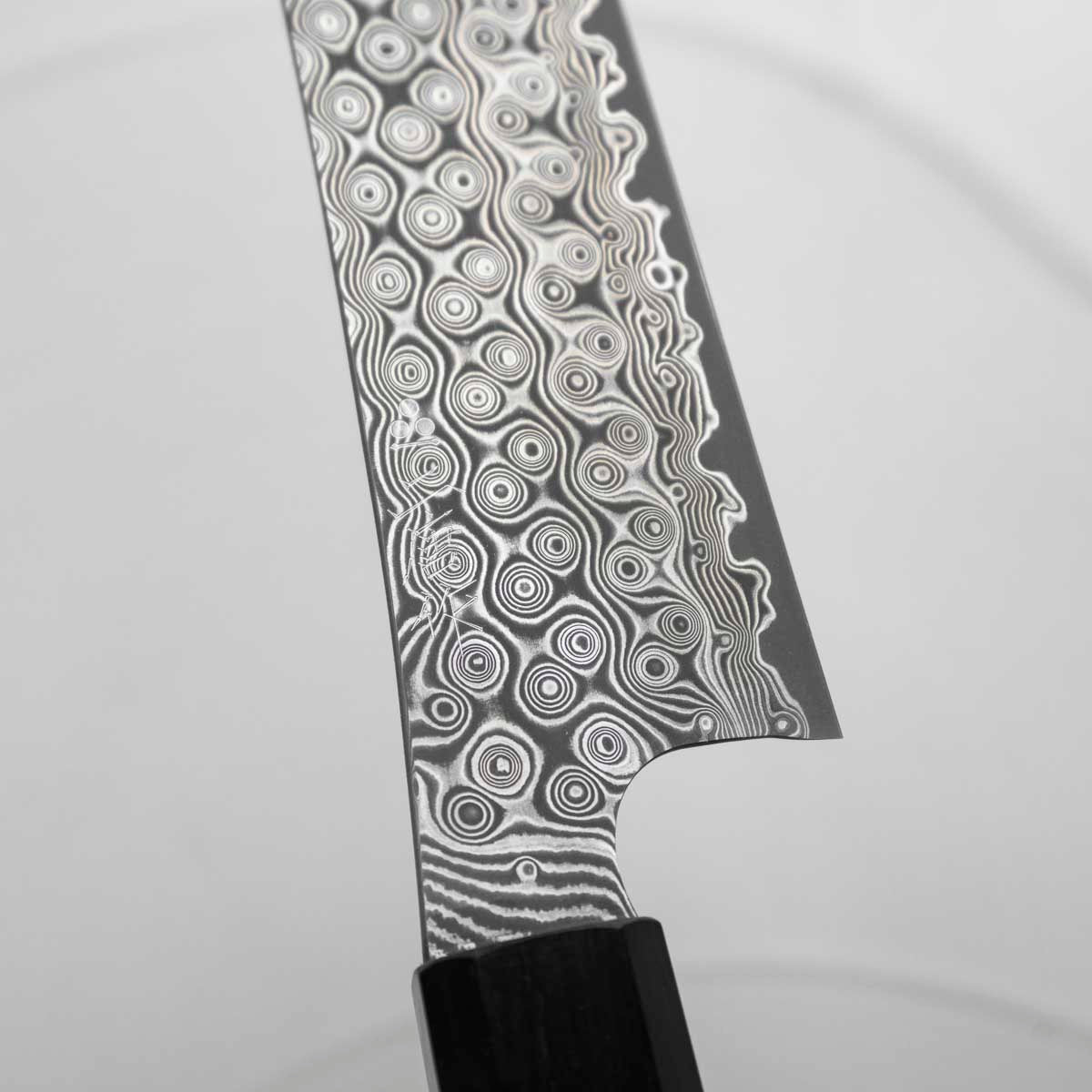 Nigara Hamono are truly some of the most experienced knifemakers in Japan. Now on their 8th generation of blacksmiths, they are masters at stainless damascus forging and heat treatment. The Anmon Damascus we have available have a matte finish and are polished underneath, resulting in a brilliant visual contrast.